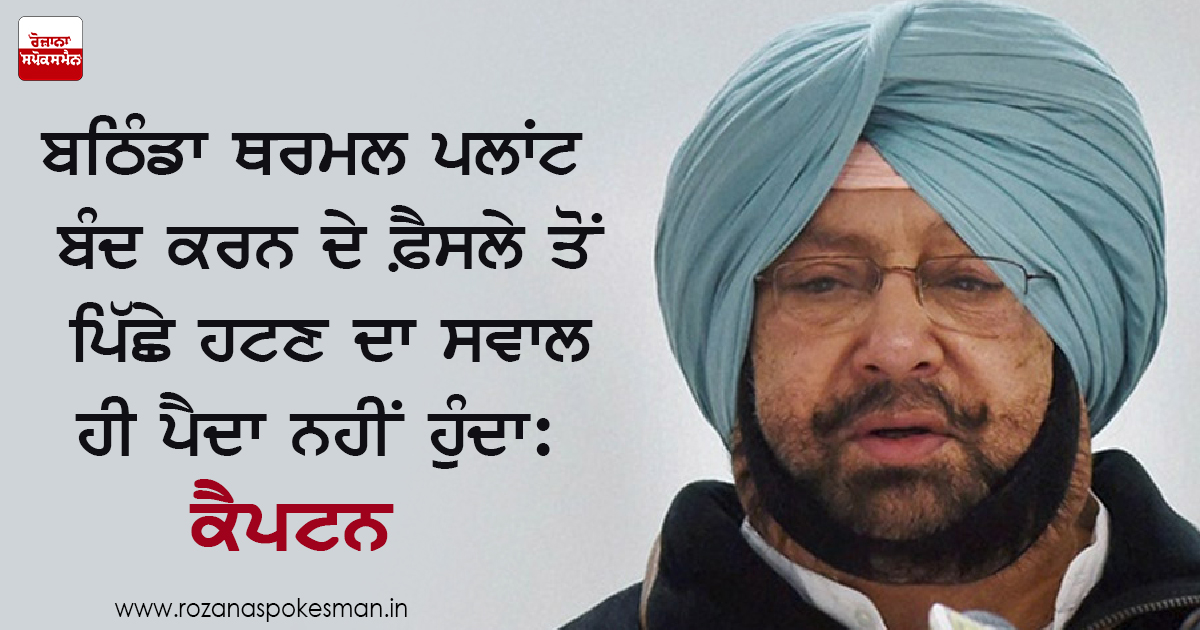 ਚੰਡੀਗੜ੍ਹ: ਪੰਜਾਬ ਦੇ ਮੁੱਖ ਮੰਤਰੀ ਕੈਪਟਨ ਅਮਰਿੰਦਰ ਸਿੰਘ ਨੇ ਗੁਰੂ ਨਾਨਕ ਦੇਵ ਥਰਮਲ ਪਲਾਂਟ, ਬਠਿੰਡਾ ਨੂੰ ਬੰਦ ਕਰਨ ਬਾਰੇ ਸਰਕਾਰ ਵਲੋਂ ਲਏ ਫ਼ੈਸਲੇ ਤੋਂ ਪਿੱਛੇ ਹਟਣ ਦੀ ਸੰਭਾਵਨਾ ਨੂੰ ਰੱਦ ਕਰ ਦਿਤਾ ਹੈ ਕਿਉਂ ਜੋ ਇਹ ਪਲਾਂਟ ਬਿਜਲੀ ਉਤਪਾਦਨ ਲਈ ਹੁਣ ਨਿਭਣਯੋਗ ਨਹੀਂ ਹੈ।