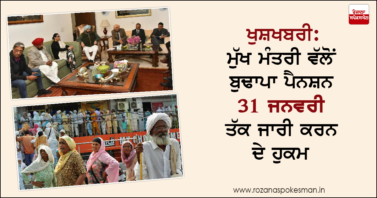 ਚੰਡੀਗੜ੍ਹ: ਮੁੱਖ ਮੰਤਰੀ ਕੈਪਟਨ ਅਮਰਿੰਦਰ ਸਿੰਘ ਨੇ ਸੂਬੇ 'ਚ ਬੁਢਾਪਾ ਪੈਨਸ਼ਨ ਲੈਣ ਵਾਲੇ ਲੋਕਾਂ ਨੂੰ ਖੁਸ਼ ਕਰ ਦਿੱਤਾ ਹੈ। ਕੈਪਟਨ ਅਮਰਿੰਦਰ ਸਿੰਘ ਨੇ ਬਕਾਇਆ ਬੁਢਾਪਾ ਪੈਨਸ਼ਨ 31 ਜਨਵਰੀ ਤੱਕ ਜਾਰੀ ਕਰਨ ਦੇ ਹੁਕਮ ਦਿੱਤੇ ਹਨ। ਉਨ੍ਹਾਂ ਲਾਭਪਾਤਰੀਆਂ ਨੂੰ ਨਿਯਮਿਤ ਭੁਗਤਾਨ ਲਈ ਸਖਤ ਹਦਾਇਤਾਂ ਵੀ ਜਾਰੀ ਕੀਤੀਆਂ ਹਨ।
