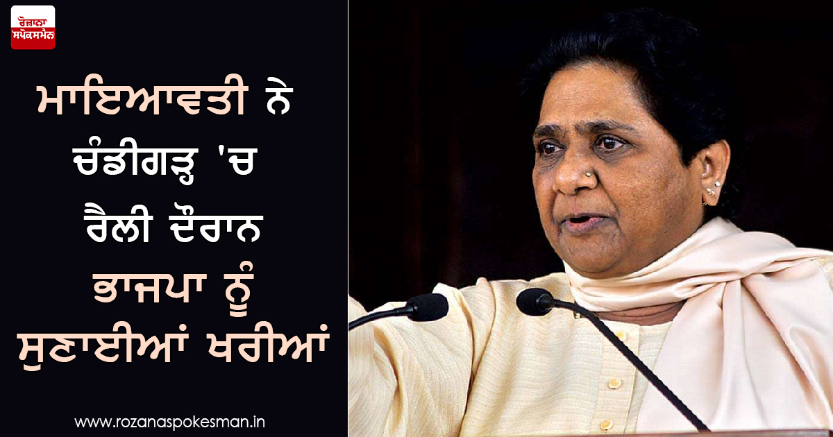 ਚੰਡੀਗੜ੍ਹ : ਬਹੁਜਨ ਸਮਾਜ ਪਾਰਟੀ (ਬਸਪਾ) ਸੁਪਰੀਮੋ ਮਾਇਆਵਤੀ ਨੇ ਵੀਰਵਾਰ ਨੂੰ ਸ਼ਹਿਰ ਦੇ ਸੈਕਟਰ-25 ਸਥਿਤ ਰੈਲੀ ਗਰਾਊਂਡ 'ਚ ਰੈਲੀ ਨੂੰ ਸੰਬੋਧਨ ਕੀਤੀ। ਰੈਲੀ 'ਚ ਸ਼ਾਮਲ ਹੋਣ ਲਈ ਹਰਿਆਣਾ ਅਤੇ ਪੰਜਾਬ ਤੋਂ ਪਾਰਟੀ ਦੇ ਕਾਰਕੁੰਨ ਪੁੱਜੇ ਹੋਏ ਸਨ। ਰੈਲੀ ਗਰਾਊਂਡ 'ਚ ਸੁਰੱਖਿਆ ਦੇ ਸਖਤ ਪ੍ਰਬੰਧ ਕੀਤੇ ਗਏ ਸਨ। ਸਭ ਤੋਂ ਪਹਿਲਾਂ ਉਨ੍ਹਾਂ ਨੇ ਪਾਰਟੀ ਦੇ ਸੰਸਥਾਪਕ ਕਾਂਸ਼ੀਰਾਮ ਦੇ ਜਨਮਦਿਨ ਦੀ ਵਧਾਈ ਦਿਤੀ।