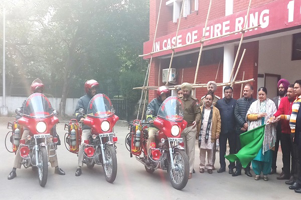 ਚੰਡੀਗੜ੍ਹ, 5 ਜਨਵਰੀ (ਸਰਬਜੀਤ ਢਿੱਲੋਂ) : ਮਿਊਂਸਪਲ ਕਾਰਪੋਰੇਸ਼ਨ ਚੰਡੀਗੜ੍ਹ ਵਲੋਂ ਸ਼ਹਿਰ ਵਿਚ ਭੀੜੀਆਂ ਤੇ ਤੰਗ ਥਾਵਾਂ 'ਤੇ ਅਸਾਨੀ ਨਾਲ ਲੰਘ ਜਾਣ ਵਾਲੇ ਫ਼ਾਇਰ ਫ਼ਾਈਟਿੰਗ ਨਵੇਂ ਖ਼ਰੀਦੇ ਸੱਤ ਮੋਟਰਸਾਈਕਲਾਂ ਨੂੰ ਹਰੀ ਝੰਡੀ ਵਿਖਾ ਕੇ ਫ਼ਾਇਰ ਬ੍ਰਿਗੇਡ ਵਿਭਾਗ ਨੂੰ ਮੇਅਰ ਆਸ਼ਾ ਜੈਸਵਾਲ ਨੇ ਸੌਂਪੇ। ਇਸ ਮੌਕੇ ਨਗਰ ਨਿਗਮ ਦੇ ਕਮਿਸ਼ਨਰ ਜਤਿੰਦਰ ਯਾਦਵ ਤੋਂ ਇਲਾਵਾ ਅਨਿਲ ਕੁਮਾਰ ਗਰਗ ਚੀਫ਼ ਫ਼ਾਇਰ ਅਫ਼ਸਰ ਕਮ ਐਡੀਸ਼ਨਲ ਕਮਿਸ਼ਨਰ ਤੇ ਕੌਂਸਲਰ ਅਰੁਣ ਸੂਦ, ਰਵੀ ਕਾਂਤ ਸ਼ਰਮਾ, ਵਿਨੋਦ ਅਗਰਵਾਲ ਅਤੇ ਸਤੀਸ਼ ਕੈਂਥ ਵੀ ਹਾਜ਼ਰ ਸਨ।