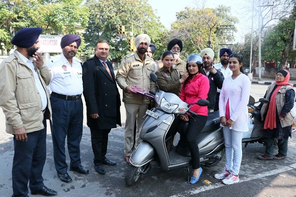 ਵਾਹਨ ਚਲਾਉਣ ਦੀ ਅਪੀਲ ਕੀਤੀ ਗਈ। ਇਸ ਮੌਕੇ ਵਾਹਨ ਚਾਲਕ ਕੁੜੀਆਂ ਨੂੰ ਹੈਲਮੇਂਟ ਵੀ ਵੰਡੇ ਗਏ। ਇਸ ਮੌਕੇ ਬਬਲੀ ਅਤੇ ਰਵਿੰਦਰ ਕੌਰ ਵਾਹਨ ਚਾਲਕ ਨੇ ਟ੍ਰੈਫਿਕ ਪੁਲਿਸ ਵਲੋਂ ਕੀਤੇ ਗਏ ਉਪਰਾਲੇ ਦੀ ਸ਼ਲਾਘਾ ਕੀਤੀ। ਇਸ ਮੌਕੇ ਮਾਰਸ਼ਲ ਜਸਬੀਰ ਸਿੰਘ ਖਹਿਰਾ, ਮਨਜੀਤ ਸਿੰਘ, ਐਸ. ਐਸ. ਵਾਲੀਆ, ਸਿਪਾਹੀ ਹਰਜਿੰਦਰ ਕੌਰ ਤੇ ਹੋਰ ਟ੍ਰੈਫਿਕ ਪੁਲਿਸ ਮੁਲਾਜ਼ਮ ਵੀ ਹਾਜ਼ਰ ਸਨ।