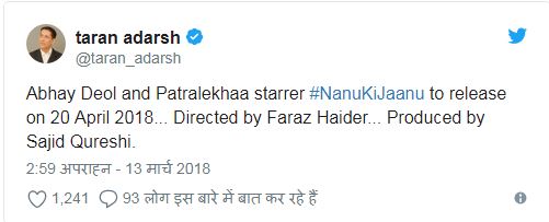ਫ਼ਿਲਮ ਆਲੋਚਕ ਅਤੇ ਮਾਰਕੀਟ ਮਾਹਰ ਤਰਣ ਆਦਰਸ਼ ਨੇ ਟਵੀਟ ਕਰ ਫ਼ਿਲਮ ਰਿਲੀਜ਼ ਦੀ ਜਾਣਕਾਰੀ ਦਿਤੀ ਹੈ। ਫ਼ਿਲਮ ਨੂੰ ਸਾਜਿਦ ਕੂਰੈਸ਼ੀ ਨੇ ਪ੍ਰੋਡਿਊਸ ਕੀਤਾ ਹੈ। ਫ਼ਿਲਮ 'ਚ ਅਭੇ ਦਿਉਲ ਅਤੇ ਪਤਰਲੇਖਾ ਦੀ ਜ਼ਬਰਦਸਤ ਕੈਮਿਸਟ੍ਰੀ ਦੇਖਣ ਨੂੰ ਮਿਲੇਗੀ।