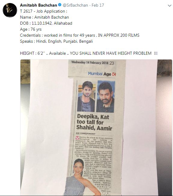 ਇਹਨਾਂ ਇੱਛਾਵਾਂ ਦੀ ਲੜੀ ਵਿਚ ਅਮਿਤਾਭ ਨੇ ਦੀਪਿਕਾ ਪਾਦੁਕੋਣ ਅਤੇ ਕੈਟਰੀਨਾ ਕੈਫ ਨਾਲ ਮੁੱਖ ਭੂਮਿਕਾ ਨਿਭਾਉਣ ਦੀ ਇੱਛਾ ਜ਼ਾਹਿਰ ਕਰਦੇ ਹੋਏ ਆਪਣਾ 'ਬਾਇਓਡਾਟਾ' ਸੋਸ਼ਲ ਮੀਡੀਆ 'ਤੇ ਸਾਂਝਾ ਕੀਤਾ ਹੈ ਜਿਥੇ ਉਹਨਾ ਨੇ ਕਿਹਾ ਹੈ ਕਿ ਇਨ੍ਹਾਂ ਦੋਵਾਂ ਦਾ ਕੱਦ ਉੱਚਾ ਹੈ, ਅਤੇ ਇਸੇ ਕਾਰਨ ਹੀ ਫਿਲਮਕਾਰਾਂ ਨੂੰ ਹੋਰ ਅਦਾਕਾਰਾਂ ਦੇ ਨਾਲ ਉਨ੍ਹਾਂ ਨੂੰ ਲੈਣ 'ਚ ਮੁਸ਼ਕਿਲਾਂ ਦਾ ਸਾਹਮਣਾ ਕਰਨਾ ਪੈਂਦਾ ਹੈ। ਤੁਹਾਨੂੰ ਦੱਸ ਦੇਈਏ ਕਿ ਅਮਿਤਾਭ ਨੇ ਟਵਿਟਰ 'ਤੇ ਇਕ ਖਬਰ ਦੀ ਕਟਿੰਗ ਨਾਲ ਆਪਣਾ ਬਾਇਓਡਾਟਾ ਸਾਂਝਾ ਕੀਤਾ ਹੈ।