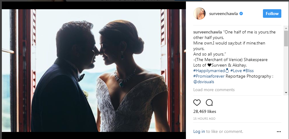 ਕਿਹਾ ਜਾ ਰਿਹਾ ਹੈ ਕਿ 28 ਜੁਲਈ 2015 ਨੂੰ ਹੀ ਸੁਰਵੀਨ ਤੇ ਅਕਸ਼ੈ ਨੇ ਵਿਆਹ ਕਰਵਾ ਲਿਆ ਸੀ। ਖਾਸ ਗੱਲ ਤਾਂ ਇਹ ਹੈ ਕਿ ਇਨ੍ਹਾਂ ਦਾ ਵਿਆਹ ਵੀ ਵਿਰਾਟ ਕੋਹਲੀ ਤੇ ਅਨੁਸ਼ਕਾ ਸ਼ਰਮਾ ਵਾਂਗ ਹੀ ਇਟਲੀ 'ਚ ਕਰੀਬੀ ਲੋਕਾਂ ਦੀ ਮੌਜ਼ੂਦਗੀ 'ਚ ਹੀ ਹੋਇਆ ਸੀ, ਅਤੇ ਇਹ ਦੋਵੇਂ ਆਪਣੇ ਵਿਆਹ ਦੀ ਘੋਸ਼ਣਾ ਲਈ ਸਹੀ ਸਮੇਂ ਦੇ ਇਤਜ਼ਾਰ ਵਿਚ ਸਨ ।