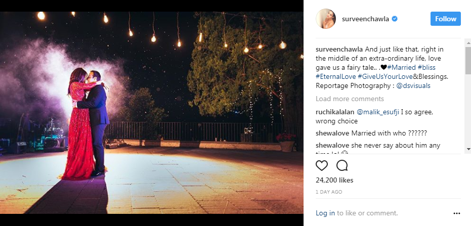 ਇਸਦੇ ਵਿਚ ਹੀ ਨਵਾਂ ਨਾਮ ਜੁੜ ਗਿਆ ਹੈ ਪੰਜਾਬੀ ਤੇ ਬਾਲੀਵੁੱਡ ਅਦਾਕਾਰਾ ਸੁਰਵੀਨ ਚਾਵਲਾ ਦਾ ਜਿੰਨਾਂ ਦੇ ਟਵੀਟ ਨੇ ਫੈਨਜ਼ ਨੂੰ ਬਹੁਤ ਵੱਡਾ ਝਟਕਾ ਦਿੱਤਾ ਹੈ । ਜੀ ਹਾਂ ਬਾਲੀਵੁਡ ਅਤੇ ਟਾਲੀਵੁਡ ਅਦਾਕਾਰਾ ਸੁਰਵੀਨ ਚਾਵਲਾ ਨੇ ਬਿਜਨੇਸ ਮੈਨ ਅਕਸ਼ੇ ਠੱਕਰ ਨਾਲ ਗੁਪਛੁਪ ਤਰੀਕੇ ਨਾਲ ਵਿਆਹ ਕਰਵਾ ਲਿਆ ਹੈ। ਇੰਨਾ ਹੀ ਨਹੀਂ ਖਬਰਾਂ ਦੀ ਮੰਨੀਏ ਤਾਂ ਸੁਰਵੀਨ ਨੇ ਦੋ ਸਾਲ ਪਹਿਲਾਂ ਹੀ ਵਿਆਹ ਕਰਵਾ ਲਿਆ ਸੀ ਅਤੇ ਇਸਦਾ ਖੁਲਾਸਾ ਹੁਣ ਕੀਤਾ ਹੈ।