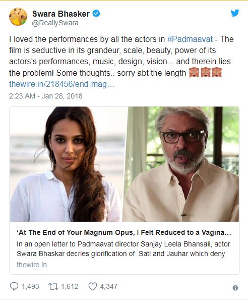 ਸਵਰਾ ਨੇ ਕਿਹਾ ਕਿ ਉਨ੍ਹਾਂ ਨੂੰ ਉਮੀਦ ਹੈ ਕਿ ਭੰਸਾਲੀ ਆਪਣੀ ਇਸ ਫਿਲਮ ਵਿੱਚ ‘ ਸਤੀਪ੍ਰਥਾ’ ਅਤੇ ‘ ਜੌਹਰ’ ਦੀ ਕੁੱਝ ਹਦ ਤੱਕ ਨਿੰਦਾ ਕਰਨਗੇ। ਉਨ੍ਹਾਂ ਨੇ ਲਿਖਿਆ ਕਿ ਤੁਹਾਡਾ ਸਿਨੇਮਾ ਮੁੱਖ ਰੂਪ ਤੋਂ ਪ੍ਰੇਰਨਾਵਾਦਕ ਅਤੇ ਸ਼ਕਤੀਸ਼ਾਲੀ ਹੈ। ਇਹ ਆਪਣੇ ਦਰਸ਼ਕਾਂ ਦੀ ਭਾਵਨਾਵਾਂ ਨੂੰ ਕੰਟਰੋਲ ਵਿੱਚ ਰੱਖਦਾ ਹੈ। ਇਹ ਸੋਚ ਨੂੰ ਪ੍ਰਭਾਵਿਤ ਕਰ ਸਕਦਾ ਹੈ ਅਤੇ ਸਰ ਜੋ ਤੁਸੀਂ ਆਪਣੀ ਫਿਲਮ ਵਿੱਚ ਜੋ ਦਿਖਾ ਰਹੇ ਹੋ ਅਤੇ ਬੋਲ ਰਹੇ ਹੋ ਇਸ ਲਈ ਕੇਵਲ ਤੁਸੀਂ ਹੀ ਜ਼ਿੰਮੇਵਾਰ ਹੋ’।