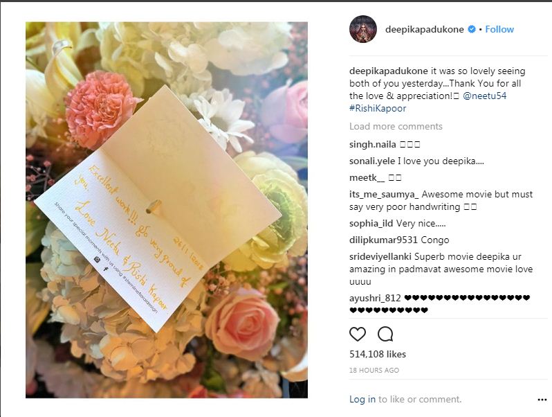 ਜਿੰਨਾ ਵਿਚ ਉਸ ਪਰਿਵਾਰ ਦਾ ਨਾਮ ਵੀ ਸ਼ਾਮਿਲ ਹੈ ਜਿੰਨਾ ਨਾਲ ਦੀਪਿਕਾ ਦਾ ਕਦੇ ਗਹਿਰਾ ਰਿਸ਼ਤਾ ਰਹਿ ਚੁੱਕਿਆ ਹੈ, ਜੀ ਹਾਂ ਅਸੀਂ ਗੱਲ ਕਰ ਰਹੇ ਹਾਂ ਦੀਪਿਕਾ ਦੇ ਐਕਸ ਬੁਆਏਫ੍ਰੈਂਡ ਯਾਨੀ ਰਣਬੀਰ ਕਪੂਰ ਦੇ ਮਾਤਾ ਪਿਤਾ ਰਿਸ਼ੀ ਕਪੂਰ ਅਤੇ ਨੀਤੂ ਕਪੂਰ ਦੀ। ਦਰਅਸਲ ਕਪੂਰ ਪਰਿਵਾਰ ਨੇ ‘ਪਦਮਾਵਤ’ ਵਿਚ ਦੀਪਿਕਾ ਦੀ ਸ਼ਾਨਦਾਰ ਅਦਾਕਾਰੀ ਦੇ ਲਈ ਫੁੱਲ ਭੇਜ ਕੇ ਵਧਾਈ ਦਿੱਤੀ।