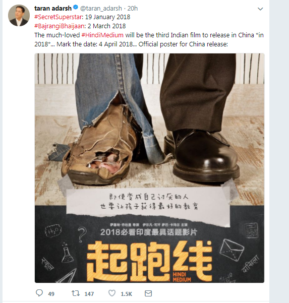 'ਹਿੰਦੀ ਮੀਡੀਅਮ' ਨੇ ਭਾਰਤ 'ਚ ਬਾਕਸ ਆਫਿਸ 'ਤੇ ਸੁਪਰਹਿਟ ਕਮਾਈ ਕੀਤੀ ਸੀ। ਭਾਰਤੀ ਫਿਲਮਾਂ ਲਈ ਚੀਨ ਇਕ ਵੱਡੇ ਬਾਜ਼ਾਰ ਦੇ ਰੂਪ 'ਚ ਉੱਭਰ ਰਿਹਾ ਹੈ। ਆਮੀਰ ਖਾਨ ਨੇ ਸਭ ਤੋਂ ਪਹਿਲਾਂ ਚੀਨ 'ਚ ਆਪਣੀ ਫਿਲਮ ਰਿਲੀਜ਼ ਕੀਤੀ ਜੋ 'ਚ ਕਾਫ਼ੀ ਹਿਟ ਰਹੀ ਹੈ। ਆਮੀਰ ਖਾਨ ਦੀ ਸੁਪਰਹਿਟ ਫਿਲਮ ਦੰਗਲ ਅਤੇ ਸੀਕਰੇਟ ਸੁਪਰਸਟਾਰ ਚੀਨ ਦੇ ਬਾਕਸ ਆਫਿਸ 'ਤੇ ਧਮਾਲ ਮਚਾ ਚੁੱਕੀ ਹੈ।