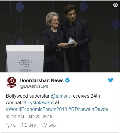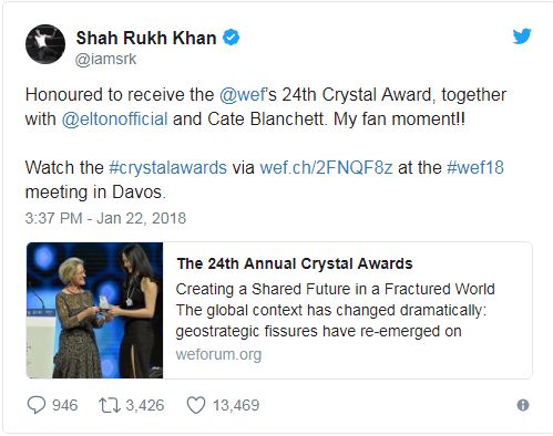 ਵਿਸ਼ਵ ਆਰਥਿਕ ਰੰਗ ਮੰਚ (ਡਬਲਿਊਈਐਫ) ਸੰਮੇਲਨ ਵਿਚ ਉਹ ਬਲੈਂਚੇਟ ਅਤੇ ਦਿੱਗਜ ਸੰਗੀਤਕਾਰ ਐਲਟਨ ਜਾਨ ਦੇ ਨਾਲ ਕ੍ਰਿਸਟਲ ਅਵਾਰਡ ਲੈਣ ਲਈ ਮੌਜੂਦ ਸਨ।