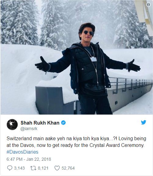 ਦਾਵੋਸ ਪੁੱਜਣ 'ਤੇ ਬਰਫਬਾਰੀ ਦੇ ਵਿਚ ਖਿੱਚਵਾਈ ਇਕ ਤਸਵੀਰ ਵੀ ਟਵੀਟ ਕੀਤੀ। ਉਨ੍ਹਾਂ ਨੇ ਲਿਖਿਆ, ਸਵਿਟਜਰਲੈਂਡ ਵਿਚ ਆਕੇ ਇਹ ਨਾ ਕੀਤਾ ਤਾਂ ਕੀ ਕੀਤਾ... ? ਦਾਵੋਸ ਵਿਚ ਚੰਗਾ ਲੱਗ ਰਿਹਾ ਹੈ।