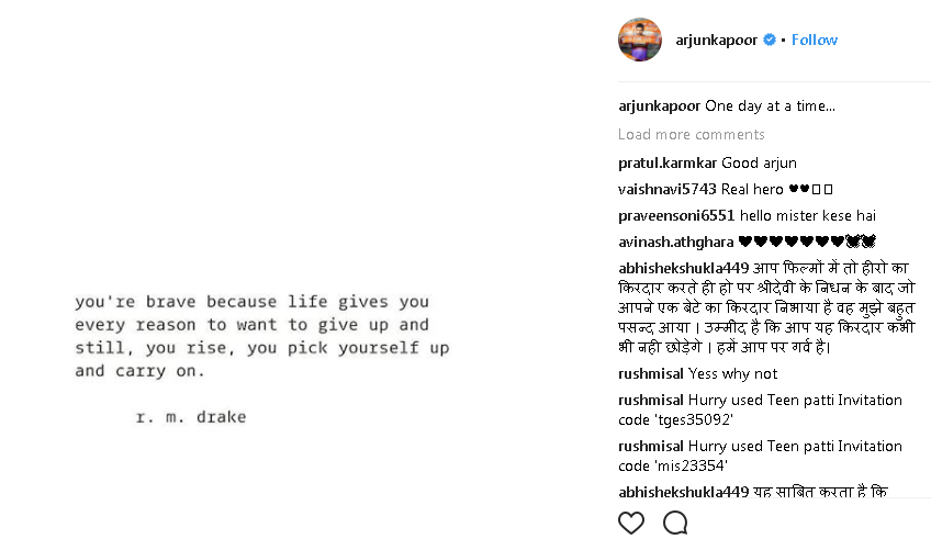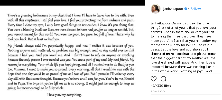 ਇਸ ਦੇ ਨਾਲ ਹੀ ਮਤਰੇਈ ਮਾਂ ਦੇ ਦਿਹਾਂਤ ਤੋਂ ਬਾਅਦ ਪਹਿਲੀ ਵਾਰ ਪੁੱਤਰ ਅਰਜੁਨ ਕਪੂਰ ਨੇ ਵੀ ਪੋਸਟ ਸਾਂਝੀ ਕੀਤੀ ਹੈ ਜਿਸ ਵਿਚ ਉਹਨਾਂ ਨੇ ਲਿਖਿਆ ਹੈ ਕਿ ਤੁਸੀਂ ਦਲੇਰ ਹੋ ਕਿਉਂਕਿ ਜ਼ਿੰਦਗੀ ਤੁਹਾਨੂੰ ਹੌਂਸਲਾ ਹਾਰਨ ਦੀ ਸਾਰੀ ਵਜ੍ਹਾ ਦਿੰਦੀ ਹੈ ਪਰ ਤੁਸੀਂ ਉੱਠਦੇ ਹੋ ਤੇ ਅੱਗੇ ਵੱਧਦੇ ਹੋ। ਲੱਗਦਾ ਹੈ ਅਰਜੁਨ ਨੇ ਇਹ ਮੈਸੇਜ ਆਪਣੇ ਪਿਤਾ ਬੋਨੀ ਤੇ ਸ਼੍ਰੀਦੇਵੀ ਦੀਆਂ ਬੇਟੀਆਂ ਜਾਹਨਵੀ ਤੇ ਖੁਸ਼ੀ ਨੂੰ ਦਿੱਤਾ ਹੈ। ਇਸ ਦੇ ਨਾਲ ਹੀ ਸੂਤਰਾਂ ਦੀ ਮੰਨੀਏ ਤਾਂ ਜਾਹਨਵੀ ਦਾ ਪਰਿਵਾਰ ਉਸਦਾ ਜਨਮਦਿਨ ਸੈਲੀਬ੍ਰੇਟ ਕਰਨ ਦੀਆਂ ਕੁਝ ਖਾਸ ਯੋਜਨਾਵਾਂ ਬਣਾਈਆਂ ਸਨ ਪਰ ਕਿਸੇ ਨੂੰ ਪਤਾ ਨਹੀਂ ਸੀ ਕਿ ਅਜਿਹਾ ਕੁਝ ਹੋ ਜਾਵੇਗਾ।