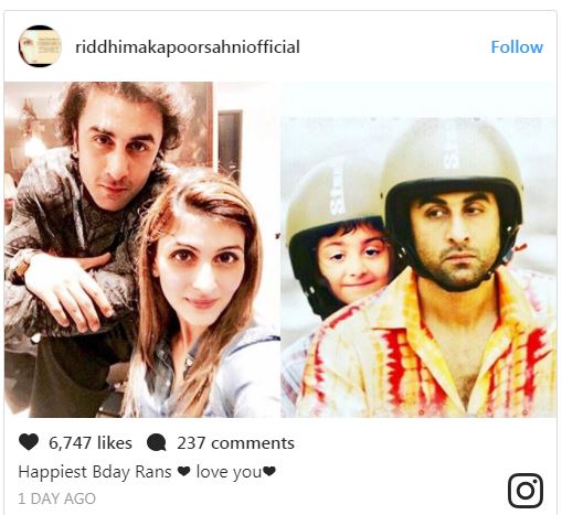 ਉਥੇ ਹੀ ਰਣਬੀਰ ਕਪੂਰ ਦੀ ਭੈਣ ਰਿੱਧਿਮਾ ਸਾਹਿਨੀ ਕਪੂਰ ਨੇ ਵੀ ਆਪਣੇ ਇੰਸਟਾਗਰਾਮ ਅਕਾਉਂਟ ਤੋਂ ਭਰਾ ਨੂੰ ਜਨਮਦਿਨ ਦੀਆਂ ਸ਼ੁੱਭਕਾਮਨਾਵਾਂ ਦਿੱਤੀਆਂ। ਉਨ੍ਹਾਂ ਨੇ ਇਸ ਮੌਕੇ ਉੱਤੇ ਤਸਵੀਰਾਂ ਦਾ ਇੱਕ ਕੋਲਾਜ ਸ਼ੇਅਰ ਕੀਤਾ। ਇੱਕ ਤਸਵੀਰ ਵਿੱਚ ਦੋਵੇਂ ਭਰਾ ਭੈਣ ਜਦੋਂ ਕਿ ਦੂਜੀ ਵਿੱਚ ਆਪਣੀ ਭਤੀਜੀ ਦੇ ਨਾਲ ਐਕਟਰ ਨਜ਼ਰ ਆ ਰਹੇ ਹਨ।