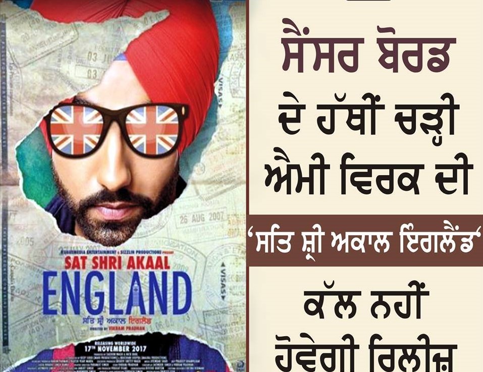 ਐਮੀ ਵਿਰਕ ਤੇ ਮੋਨਿਕਾ ਗਿੱਲ ਸਟਾਰਰ ਫਿਲਮ 'ਸਤਿ ਸ਼੍ਰੀ ਅਕਾਲ ਇੰਗਲੈਂਡ' ਸੈਂਸਰ ਬੋਰਡ ਦੇ ਹੱਥੀਂ ਚੜ੍ਹ ਗਈ ਹੈ। ਇਸ ਦੇ ਚਲਦਿਆਂ ਫਿਲਮ ਦੀ ਰਿਲੀਜ਼ ਡੇਟ ਵੀ ਰੱਦ ਹੋ ਗਈ ਹੈ। ਪਹਿਲਾਂ ਇਹ ਫਿਲਮ 17 ਨਵੰਬਰ ਯਾਨੀ ਕੱਲ ਰਿਲੀਜ਼ ਹੋਣੀ ਸੀ ਪਰ ਹੁਣ ਅਗਲੀ ਤਰੀਕ ਦਾ ਐਲਾਨ ਹੋਣ ਤਕ ਫਿਲਮ ਦੀ ਰਿਲੀਜ਼ਿੰਗ ਟਾਲ ਦਿੱਤੀ ਗਈ ਹੈ।
