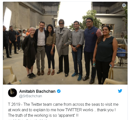 ਟਵਿੱਟਰ ਅਤੇ ਅਮਿਤਾਭ ਦੋਨੋਂ ਹੀ ਸੁਰਖੀਆਂ ਵਿਚ ਰਹਿੰਦੇ ਹਨ, ਜਿਥੇ ਬੀਤੇ ਦਿਨ ਅਮਿਤਾਭ ਨੇ ਟਵਿੱਟਰ ਤੇ ਬਾਇਓਡਾਟਾ ਅਪਡੇਟ ਕਰਕੇ ਦੀਪਿਕਾ ਅਤੇ ਕੈਟਰੀਨਾ ਦੇ ਨਾਲ ਲੀਡ ਹੀਰੋ ਵਜੋਂ ਕੰਮ ਕਰਨ ਦੀ ਇੱਛਾ ਜ਼ਾਹਿਰ ਕੀਤੀ ਸੀ। ਤੁਹਾਨੂੰ ਦੱਸ ਦੇਈਏ ਕਿ ਟਵਿੱਟਰ ਨਾਲ ਮੋਹ ਰੱਖਣ ਵਾਲੇ ਬਾਲੀਵੁੱਡ ਮਹਾਨਾਇਕ ਅਮਿਤਾਭ ਬੱਚਨ ਨੇ ਟਵਿੱਟਰ ਦੇ ਕਰਮਚਾਰੀਆਂ ਨਾਲ ਮੁਲਾਕਾਤ ਕੀਤੀ। ਜਿਥੇ ਉਹਨਾਂ ਨੇ ਟਵਿਟਰ ਦੇ ਕੰਮ ਕਰਨ ਦੇ ਤਰੀਕੇ ਨੂੰ ਸਮਝਣ ਦੀ ਕੋਸ਼ਿਸ਼ ਕੀਤੀ।