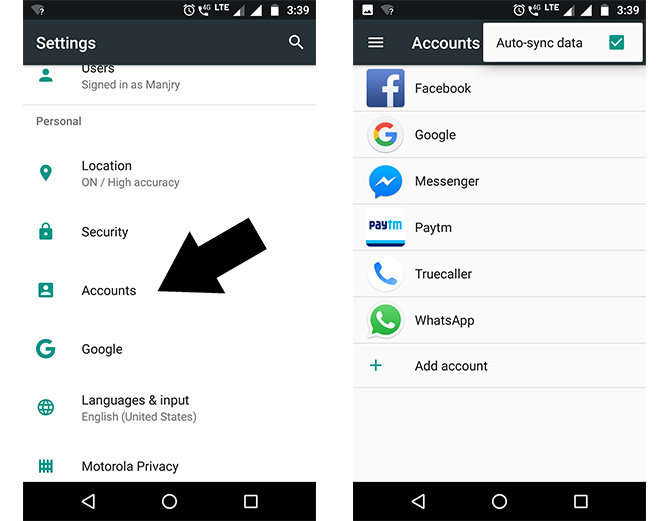 ਇਸਦੇ ਲਈ ਫੋਨ ਦੀ ਸੈਟਿੰਗ ਵਿੱਚ ਜਾਕੇ Account ਉੱਤੇ ਜਾਓ। ਇੱਥੇ ਤੁਹਾਨੂੰ ਤਿੰਨ ਡਾਟ ਉੱਤੇ ਟੈਪ ਕਰਨਾ ਹੈ। ਹੁਣ Auto Sync ਉੱਤੇ ਆਫ ਕਰ ਦਿਓ। ਇਸਨੂੰ ਆਫ ਕਰਦੇ ਹੀ ਫੋਨ ਸਕਰੀਨ ਉੱਤੇ ਮੈਸੇਜ ਵਿਖਾਈ ਦੇਵੇਗਾ ਕਿ ਜਿਸ ਵਿੱਚ ਲਿਖਿਆ ਹੋਵੇਗਾ ਕਿ ਇਸਤੋਂ ਤੁਹਾਡਾ ਡਾਟਾ ਅਤੇ ਬੈਟਰੀ ਸੇਵ ਹੋਵੇਗੀ।