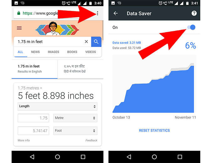 ਇਸਦੇ ਲਈ ਕ੍ਰੋਮ ਬਰਾਉਜਰ ਨੂੰ ਓਪਨ ਕਰੋ। ਇੱਥੇ ਉਪਰ ਦੀ ਤਰਫ ਵਿਖਾਈ ਦੇ ਰਹੇ ਤਿੰਨ ਡਾਟ ਉੱਤੇ ਟੈਪ ਕਰੋ। ਹੁਣ settings ਉੱਤੇ ਟੈਪ ਕਰਨ ਉੱਤੇ Data Saver ਆਪਸ਼ਨ ਵਿਖਾਈ ਦੇਵੇਗਾ। ਉਸ ਉੱਤੇ ਟੈਪ ਕਰ ਆਨ ਕਰ ਦਿਓ।