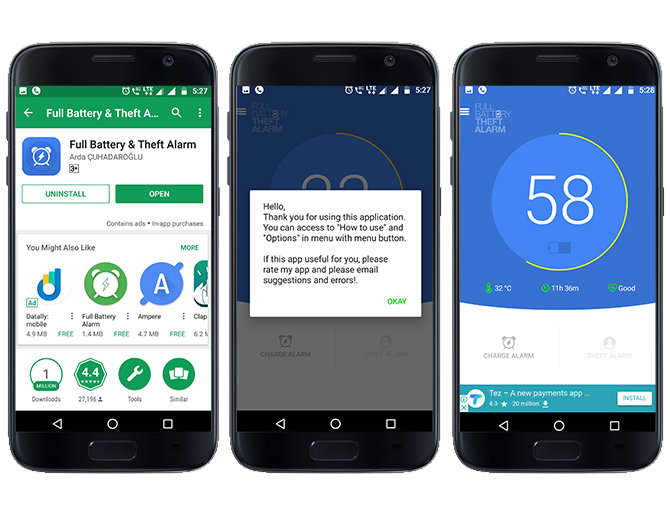 ਫੋਨ ਦੇ ਚਾਰਜਿੰਗ ਉੱਤੇ ਨਜ਼ਰ ਰੱਖਣ ਵਾਲੇ ਐਪ ਦਾ ਨਾਮ Full Battery & Theft Alarm ਹੈ। ਇਸਨੂੰ ਐਂਡਰਾਇਡ ਯੂਜਰਸ ਫੋਨ ਵਿੱਚ ਫਰੀ ਇੰਸਟਾਲ ਕਰ ਸਕਦੇ ਹਨ। ਇਸ ਐਪ ਦਾ ਸਾਇਜ ਸਿਰਫ 2 . 9MB ਹੈ। ਯਾਨੀ ਫੋਨ ਵਿੱਚ ਇਹ ਜ਼ਿਆਦਾ ਸਪੇਸ ਵੀ ਨਹੀਂ ਲੈਂਦਾ। ਇਸ ਐਪ ਨੂੰ ਹੁਣ ਤੱਕ 50 ਲੱਖ ਵਾਰ ਇੰਸਟਾਲ ਕੀਤਾ ਜਾ ਚੁੱਕਿਆ ਹੈ।