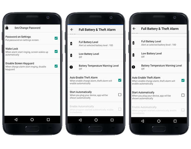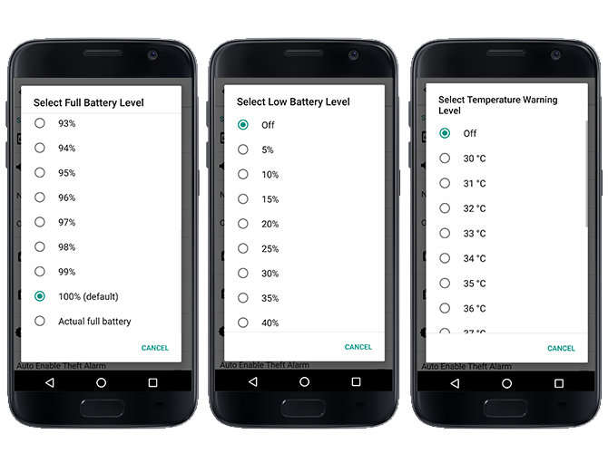 ਸੈਟਿੰਗ ਵਿੱਚ ਫੁਲ ਬੈਟਰੀ ਲੇਬਲ, ਲੋਅ ਬੈਟਰੀ ਲੇਬਲ ਅਤੇ ਬੈਟਰੀ ਟੈਂਪਰੇਚਰ ਵਾਰਨਿੰਗ ਦੇ ਆਪਸ਼ਨ ਦਿੱਤੇ ਹੁੰਦੇ ਹਨ। ਇਸ ਸਾਰੇ ਆਪਸ਼ਨ ਵਿੱਚ ਯੂਜਰ ਆਪਣੇ ਮੁਤਾਬਕ ਉਸਦਾ ਪਰਸੈਂਟ ਸਿਲੈਕਟ ਕਰ ਸਕਦਾ ਹੈ। ਯਾਨੀ ਬੈਟਰੀ ਫੁਲ ਹੋਣ ਦਾ ਪਰਸੈਂਟ ਜੇਕਰ 80 ਸਿਲੈਕਟ ਕੀਤਾ ਤੱਦ ਫੋਨ 80 % ਚਾਰਜ ਹੁੰਦੇ ਹੀ ਅਲਾਰਮ ਵੱਜਣਾ ਸ਼ੁਰੂ ਹੋ ਜਾਵੇਗਾ। ਇਸ ਤਰ੍ਹਾਂ, ਦੂਜੇ ਆਪਸ਼ਨ ਵੀ ਸਿਲੈਕਟ ਕਰ ਸਕਦੇ ਹੋ।