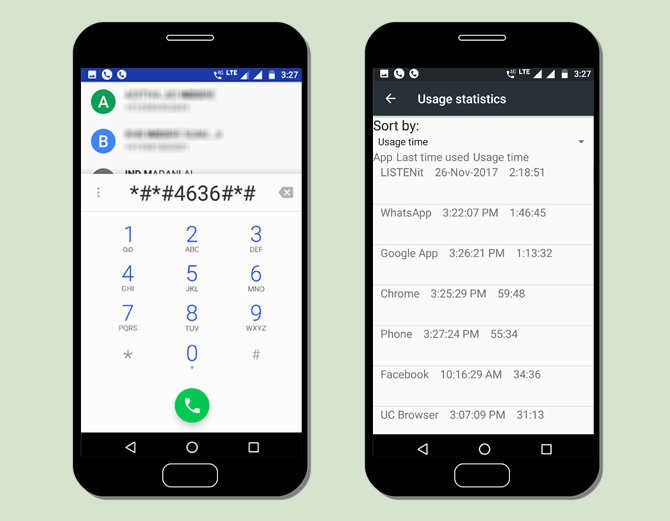 ਸਭ ਤੋਂ ਪਹਿਲਾਂ ਆਪਣੇ ਸਮਾਰਟਫੋਨ ਤੋਂ * # * # 4636 # * # * ਨੰਬਰ ਡਾਇਲ ਕਰੋ। ਜਿਵੇਂ ਹੀ ਆਖਰੀ ਨੰਬਰ * ਡਾਇਲ ਹੋਵੇਗਾ ਤੁਹਾਡੇ ਸਾਹਮਣੇ ਇੱਕ ਨਵੀਂ ਵਿੰਡੋ ਓਪਨ ਹੋ ਜਾਵੇਗੀ। ਇਸ ਵਿੱਚ ਫੋਨ ਇੰਫਾਰਮੇਸ਼ਨ ਦੇ ਨਾਲ ਯੂਜ ਦਾ ਵੀ ਆਪਸ਼ਨ ਦਿੱਤਾ ਹੁੰਦਾ ਹੈ।