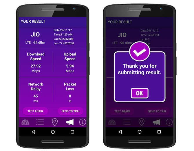ਡਾਉਨਲੋਡ ਅਤੇ ਅਪਲੋਡ ਸਪੀਡ ਕਾਉਂਟ ਹੋਣ ਦੇ ਬਾਅਦ ਰਿਜਲਟ ਸਾਹਮਣੇ ਆ ਜਾਂਦਾ ਹੈ। ਇੱਥੇ ਤੁਹਾਡੇ ਟੈਲੀਕਾਮ ਨੈੱਟਵਰਕ ਨਾਲ ਜੁੜੀ ਡਿਟੇਲ ਵੀ ਦਿੱਤੀ ਜਾਂਦੀ ਹੈ। ਯੂਜਰ ਇਸ ਰਿਜਲਟ ਨੂੰ TRAI ਨੂੰ ਸੈਂਡ ਵੀ ਕਰ ਸਕਦੇ ਹਨ।