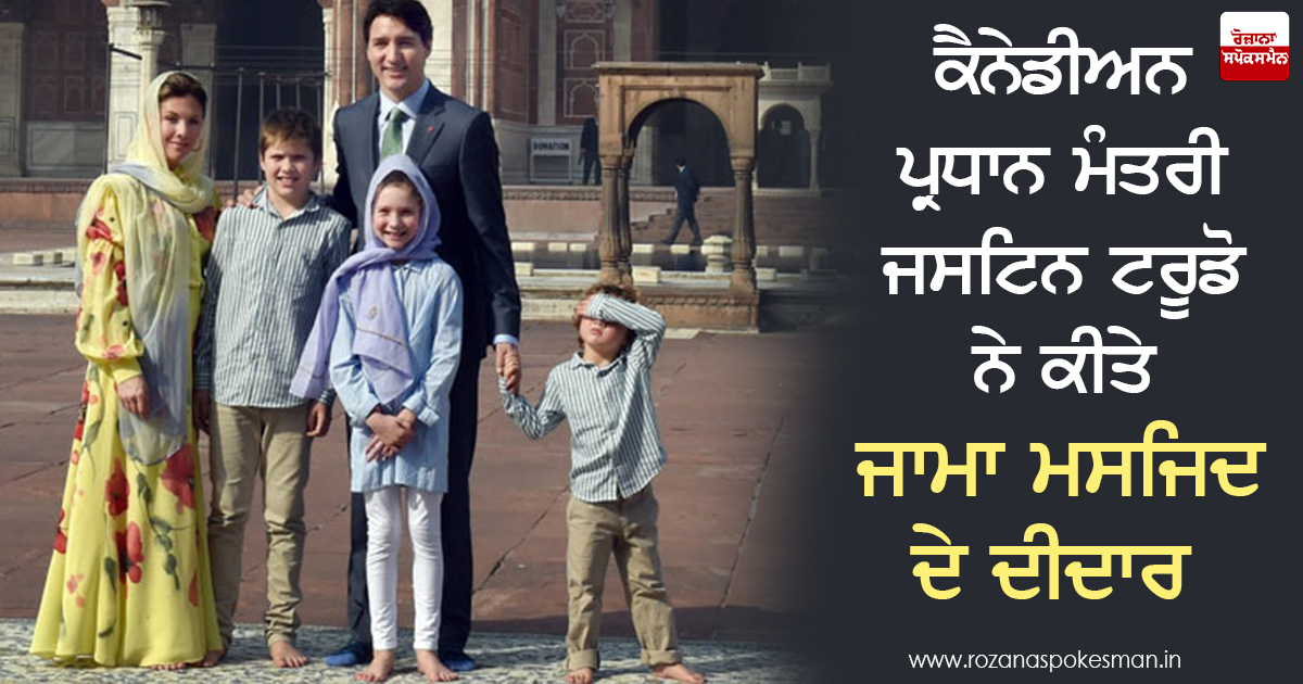 ਨਵੀਂ ਦਿੱਲੀ : ਅੰਮ੍ਰਿਤਸਰ ਦੌਰੇ ਤੋਂ ਬਾਅਦ ਕੈਨੇਡਾ ਦੇ ਪ੍ਰਧਾਨ ਮੰਤਰੀ ਜਸਟਿਨ ਟਰੂਡੋ ਅਤੇ ਉਨ੍ਹਾਂ ਦੇ ਪਰਿਵਾਰ ਨੇ ਵੀਰਵਾਰ ਨੂੰ ਇਤਿਹਾਸਕ ਜਾਮਾ ਮਸਜਿਦ ਦੇ ਦੀਦਾਰ ਕੀਤੇ। ਦੱਸ ਦੇਈਏ ਕਿ ਟਰੂਡੋ ਇਕ ਹਫਤੇ ਦੀ ਭਾਰਤ ਯਾਤਰਾ 'ਤੇ ਆਏ ਹੋਏ ਹਨ।