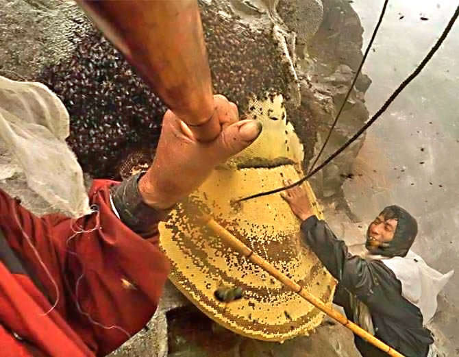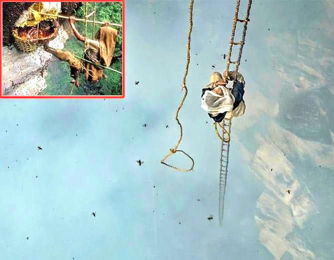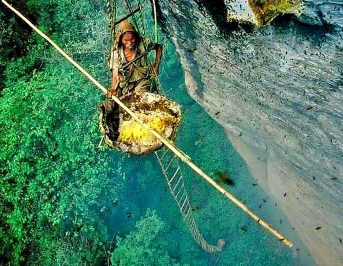 ਇਹ ਫੋਟੋ ਨੇਪਾਲ ਦੇ ਸੱਦੀ ਪਿੰਡ ਦੀ ਹੈ। ਕਰੀਬ 400 ਫੀਟ ਦੀ ਉਚਾਈ ਉੱਤੇ ਸਿਰਫ ਬਾਂਸ ਦੀ ਪੌੜੀ ਉੱਤੇ ਲਮਕ ਕੇ ਸ਼ਹਿਦ ਕੱਢ ਰਿਹਾ ਇਹ ਵਿਅਕਤੀ ਮਾਉਲੀ ਦਨ ਹੈ। ਮਾਉਲੀ 57 ਸਾਲ ਦਾ ਹੈ ਅਤੇ ਹੁਣ ਵੀ ਹਿਮਾਲਿਆ ਦੇ ਉੱਚੇ - ਉੱਚੇ ਪਹਾੜਾਂ ਉੱਤੇ ਜਾ ਕੇ ਸ਼ਹਿਦ ਕੱਢਦਾ ਹੈ। ਮਾਉਲੀ ਗੁਰੰਗ ਜਨਜਾਤੀ ਦੇ ਹਨ। ਨੇਪਾਲ ਦੀ ਇਹ ਜਨਜਾਤੀ ਸ਼ਹਿਦ ਦੇ ਖਤਰਨਾਕ ਸ਼ਿਕਾਰੀਆਂ ਦੇ ਰੂਪ ਵਿੱਚ ਜਾਣੀ ਜਾਂਦੀ ਹੈ।