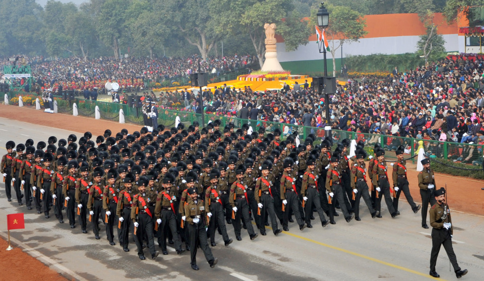 ਇਰਵਿਨ ਸਟੇਡੀਅਮ ਜੈ-ਜੈਕਾਰ ਦੇ ਨਾਅਰਿਆਂ ਨਾਲ ਗੂੰਜ ਉੱਠਿਆ ਸੀ ਤੇ ਲੋਕ ਰੁੱਖਾਂ, ਇਮਾਰਤਾਂ ਤੇ ਜੋ ਸੰਭਵ ਥਾਵਾਂ ਸਨ, ’ਤੇ ਚਡ਼੍ਹ ਕੇ ਖੁਸ਼ੀ ਵਿੱਚ ਜੈ-ਜੈਕਾਰ ਕਰ ਰਹੇ ਸਨ। ਰਾਸ਼ਟਰਪਤੀ ਹੱਥ ਜੋਡ਼ ਕੇ ਇਨ੍ਹਾਂ ਦਾ ਹੁੰਗਾਰਾ ਭਰ ਰਹੇ ਸਨ। ਪੂਰੇ 3:45 ਵਜੇ ਇਹ ਬੱਘੀ ਇਰਵਿਨ ਸਟੇਡੀਅਮ ਵਿੱਚ ਪੁੱਜੀ ਜਿੱਥੇ 3000 ਅਫਸਰ ਤੇ ਤਿੰਨੇ ਭਾਰਤੀ ਸੈਨਾਵਾਂ ਦੇ ਦੋ ਜਰਨੈਲ ਤੇ ਪੁਲੀਸ ਰਸਮੀ ਪਰੇਡ ਲਈ ਤਣੇ ਹੋਏ ਸਨ।