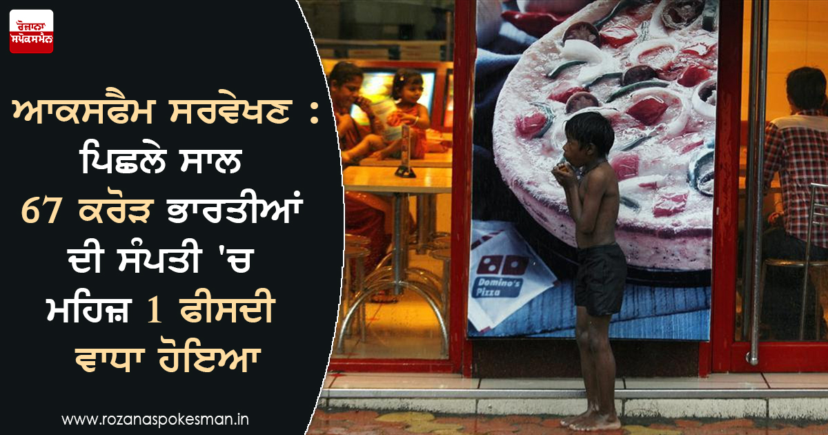 ਇਸ ਸਾਲ ਦੇ ਸਰਵੇਖਣ ਨੇ ਇਹ ਵੀ ਦਿਖਾਇਆ ਹੈ ਕਿ ਸਾਲ 2017-18 ਦੌਰਾਨ ਭਾਰਤ ਦੇ ਸਭ ਤੋਂ ਅਮੀਰ ਇਕ ਦੌਲਤ ਨੂੰ 20.9 ਲੱਖ ਕਰੋਡ਼ ਰੁਪਏ ਤੋਂ ਵੱਧ ਕੇ ਵਧਾਇਆ ਗਿਆ- 2017-18 ਵਿੱਚ ਕੇਂਦਰੀ ਸਰਕਾਰ ਦੇ ਕੁੱਲ ਬਜਟ ਦੇ ਬਰਾਬਰ ਰਕਮ, Oxfam ਇੰਡੀਆ ਨੇ ਕਿਹਾ,'ਰਿਵਾਰਡ ਵਰਕ, ਨਾਸ ਵੈਲਥ' ਨਾਮਕ ਰਿਪੋਰਟ ਵਿਚ ਦੱਸਿਆ ਗਿਆ ਹੈ ਕਿ ਕਿਵੇਂ ਗਰੀਬੀ ਨੇ ਅਮੀਰ ਅਮੀਰਾਂ ਨੂੰ ਵਿਸ਼ਾਲ ਧਨ ਇਕੱਠਾ ਕਰਨ ਦੀ ਸਮਰੱਥਾ ਦਿੱਤੀ ਹੈ ਭਾਵੇਂ ਕਿ ਲੱਖਾਂ ਲੋਕ ਗਰੀਬੀ ਦੀ ਅਦਾਇਗੀ 'ਤੇ ਜਿਉਂਦੇ ਰਹਿਣ ਲਈ ਸੰਘਰਸ਼ ਕਰਦੇ ਹਨ।