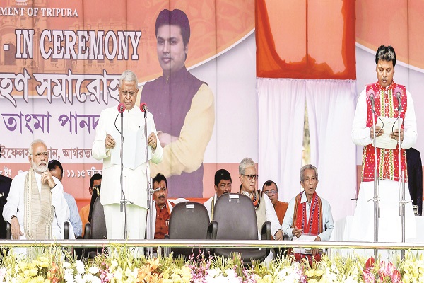 ਸਨ। ਮੋਦੀ ਨੇ ਕਿਹਾ ਕਿ ਉੱਤਰ ਪੂਰਬ ਖੇਤਰ ਕੋਲ ਮੌਕੇ ਅਤੇ ਸਮਰੱਥਾ ਹੈ ਜਿਨ੍ਹਾਂ ਨੂੰ ਸੂਬੇ ਦੇ ਵਿਕਾਸ ਲਈ ਵਰਤਿਆ ਜਾਵੇਗਾ। ਉਨ੍ਹਾਂ ਕਿਹਾ ਕਿ ਕੇਂਦਰ ਸਰਕਾਰ ਤ੍ਰਿਪੁਰਾ ਨੂੰ ਪੂਰੀ ਮਦਦ ਦੇਵੇਗੀ। ਮੋਦੀ ਨੇ ਕਿਹਾ ਕਿ ਉਹ ਚਾਹੁੰਦੇ ਹਨ ਕਿ ਤ੍ਰਿਪੁਰਾ ਨੂੰ ਨਵੀਆਂ ਉਚਾਈਆਂ 'ਤੇ ਲਿਜਾਇਆ ਜਾਵੇ ਤਾਕਿ ਲੋਕਾਂ ਦੀ ਜ਼ਿੰਦਗੀ ਬਦਲ ਸਕੇ। ਸਹੁੰ ਚੁੱਕ ਸਮਾਗਮ ਅਸਮ ਰਾਈਫ਼ਲਜ਼ ਦੇ ਮੈਦਾਨ ਵਿਚ ਕਰਵਾਇਆ ਗਿਆ। (ਏਜੰਸੀ)