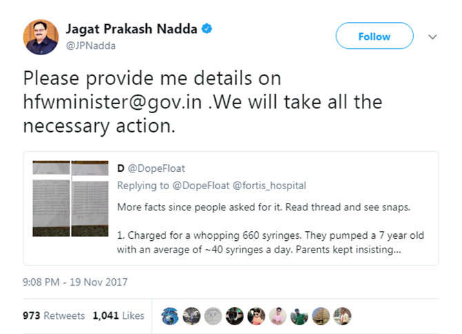 - 4 ਦਿਨ ਦੇ ਅੰਦਰ ਹੀ ਇਸ ਪੋਸਟ ਨੂੰ 9000 ਤੋਂ ਜ਼ਿਆਦਾ ਯੂਜਰਸ ਨੇ ਰੀ-ਟਵੀਟ ਕੀਤਾ। ਇਸਦੇ ਬਾਅਦ ਹੈਲਥ ਮਿਨਿਸਟਰ ਜੇਪੀ ਨੱਡਾ ਨੇ ਹਸਪਤਾਲ ਤੋਂ ਰਿਪੋਰਟ ਮੰਗੀ। ਨੱਡਾ ਨੇ ਐਤਵਾਰ ਨੂੰ ਟਵੀਟ ਕੀਤਾ, ਕ੍ਰਿਪਾ ਆਪਣੀ ਸਾਰੀ ਜਾਣਕਾਰੀ hfwminister @ gov . in ਉੱਤੇ ਮੈਨੂੰ ਭੇਜੋ। ਅਸੀ ਸਾਰੀ ਜਰੂਰੀ ਕਾਰਵਾਈ ਕਰਾਂਗੇ।