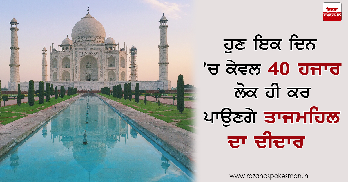 ਭਾਰਤੀਆਂ ਲਈ ਤਾਜਮਹਿਲ ਦਰਸ਼ਨ ਹੁਣ ਆਸਾਨ ਨਹੀਂ ਰਹਿ ਪਾਵੇਗਾ। ਤਾਜਮਹਲ ਦੇਖਣ ਵਾਲਿਆਂ ਦੀ ਸੀਮਾ ਗਿਣਤੀ 'ਤੇ ਸਰਕਾਰੀ ਅਧਿਕਾਰੀ ਵਿਚਾਰ ਕਰ ਰਹੇ ਹਨ ਅਤੇ ਕੇਵਲ ਇਕ ਦਿਨ 'ਚ 40 ਹਜਾਰ ਭਾਰਤੀ ਲੋਕਾਂ ਨੂੰ ਹੀ ਤਾਜਮਹਿਲ ਦੇਖਣ ਦਾ ਮੌਕਾ ਮਿਲੇਗਾ। 20 ਜਨਵਰੀ ਤੋਂ ਇਸ ਆਦੇਸ਼ ਦੇ ਲਾਗੂ ਹੋਣ ਦੀ ਸੰਭਾਵਨਾ ਵਿਅਕਤ ਕੀਤੀ ਜਾ ਰਹੀ ਹੈ।