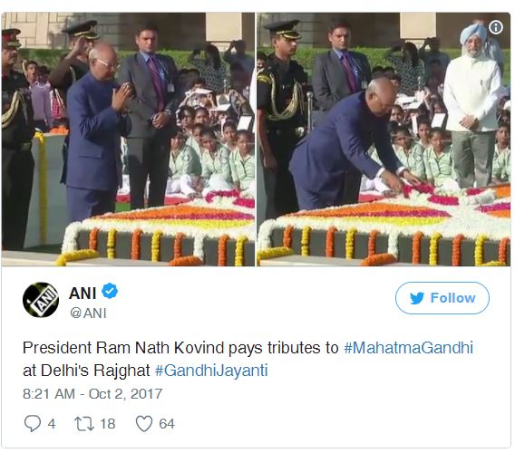 ਰਾਸ਼ਟਰਪਤੀ ਰਾਮਨਾਥ ਕੋਵਿੰਦ ਨੇ ਰਾਜਘਾਟ ਪਹੁੰਚਕੇ ਮਹਾਤਮਾ ਗਾਂਧੀ ਨੂੰ ਸ਼ਰਧਾਂਜਲੀ ਦਿੱਤੀ।