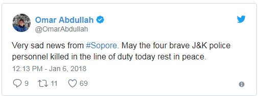 ਜੰਮੂ - ਕਸ਼ਮੀਰ ਦੇ ਸਾਬਕਾ ਮੁੱਖ ਮੰਤਰੀ ਉਮਰ ਅਬਦੁੱਲਾ ਨੇ ਕਿਹਾ ਕਿ ਸੋਪੋਰ ਤੋਂ ਇਕ ਬਹੁਤ ਦੁਖਦ ਖਬਰ ਹੈ। ਜੰਮੂ - ਕਸ਼ਮੀਰ ਪੁਲਿਸ ਦੇ ਚਾਰ ਬਹਾਦੁਰ ਪੁਲਿਸਕਰਮੀ ਡਿਊਟੀ ਦੇ ਦੌਰਾਨ ਸ਼ਹੀਦ ਹੋ ਗਏ। ਪ੍ਰਮਾਤਮਾ ਉਨ੍ਹਾਂ ਦੀ ਆਤਮਾ ਨੂੰ ਸ਼ਾਂਤੀ ਦੇਵੇ।