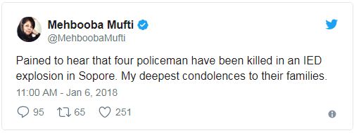 ਮੁੱਖ ਮੰਤਰੀ ਮਹਿਬੂਬਾ ਮੁਫਤੀ ਨੇ ਟਵੀਟ ਕਰਕੇ ਕਿਹਾ ਹੈ ਕਿ ਸੋਪੋਰ ਵਿਚ ਆਈਈਡੀ ਵਿਸਫੋਟ ਵਿਚ ਚਾਰ ਪੁਲਿਸਕਰਮੀ ਸ਼ਹੀਦ ਹੋ ਗਏ ਹਨ। ਉਨ੍ਹਾਂ ਦੇ ਪਰਿਵਾਰ ਦੇ ਪ੍ਰਤੀ ਮੇਰੀ ਡੂੰਘੀ ਸੰਵੇਦਨਾ ਹੈ।