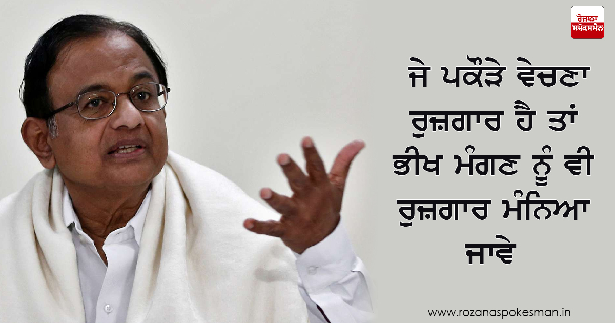 ਨਵੀਂ ਦਿੱਲੀ: ਸਾਬਕਾ ਕੇਂਦਰੀ ਮੰਤਰੀ ਪੀ ਚਿਦੰਬਰਮ ਨੇ ਪ੍ਰਧਾਨ ਮੰਤਰੀ ਨਰਿੰਦਰ ਮੋਦੀ 'ਤੇ ਵਿਅੰਗ ਕਰਦਿਆਂ ਕਿਹਾ ਕਿ ਜੇ ਪ੍ਰਧਾਨ ਮੰਤਰੀ ਦੀ ਗੱਲ ਕਿ ਪਕੌੜੇ ਵੇਚਣਾ ਵੀ ਰੁਜ਼ਗਾਰ ਹੈ, ਨੂੰ ਮੰਨ ਲਿਆ ਜਾਵੇ ਤਾਂ ਭੀਖ ਮੰਗਣਾ ਵੀ ਇਕ ਰੁਜ਼ਗਾਰ ਹੈ। ਸੋ ਉਨ੍ਹਾਂ ਗ਼ਰੀਬਾਂ ਅਤੇ ਅਪਾਹਜ ਵਿਅਕਤੀਆਂ ਨੂੰ 'ਰੁਜ਼ਗਾਰ 'ਤੇ ਲੱਗੇ ਲੋਕ' ਮੰਨਿਆ ਜਾਵੇ ਜਿਹੜੇ ਭੀਖ ਮੰਗਣ ਲਈ ਮਜਬੂਰ ਹਨ।