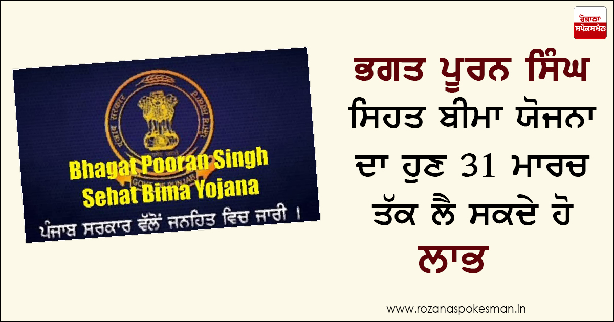 ਸ੍ਰੀ ਮੁਕਤਸਰ ਸਾਹਿਬ : ਪੰਜਾਬ ਸਰਕਾਰ ਨੇ ਲਾਭਪਾਤਰੀਆਂ ਨੂੰ ਲਾਭ ਮੁਹੱਈਆ ਕਰਵਾਉਣ ਲਈ ਭਗਤ ਪੂਰਨ ਸਿੰਘ ਸਿਹਤ ਬੀਮਾ ਯੋਜਨਾ ਦੀ ਪਾਲਿਸੀ 31 ਮਾਰਚ 2018 ਤੱਕ ਵਧਾ ਦਿੱਤੀ ਹੈ। ਇਸ ਮੌਕੇ ਡਾ: ਸੁਮੀਤ ਜਾਰੰਗਲ ਆਈ. ਏ. ਐਸ. ਡਿਪਟੀ ਕਮਿਸ਼ਨਰ ਸ੍ਰੀ ਮੁਕਤਸਰ ਸਾਹਿਬ ਨੇ ਜਾਣਕਾਰੀ ਦਿੰਦਿਆਂ ਕਿਹਾ ਕਿ ਇਸ ਯੋਜਨਾ ਅਧੀਨ ਲਾਭਪਾਤਰੀਆਂ ਨੂੰ 50,000 ਰੁਪਏ ਤੱਕ ਦੀ ਨਗਦੀ ਰਹਿਤ ਸਿਹਤ ਬੀਮਾ ਸੁਰੱਖਿਆ, 5 ਲੱਖ ਰੁਪਏ ਤੱਕ ਦਾ ਦੁਰਘਟਨਾ 'ਚ ਮੌਤ, ਅਪੰਗਤਾ ਕਾਰਨ ਬੀਮਾ ਸੁਰੱਖਿਆ ਅਤੇ ਅੱਗ ਕਾਰਨ ਹੋਏ ਨੁਕਸਾਨ ਹੋਣ ਦੇ ਲਾਭ ਦਿੱਤੇ ਜਾਂਦੇ ਹਨ।