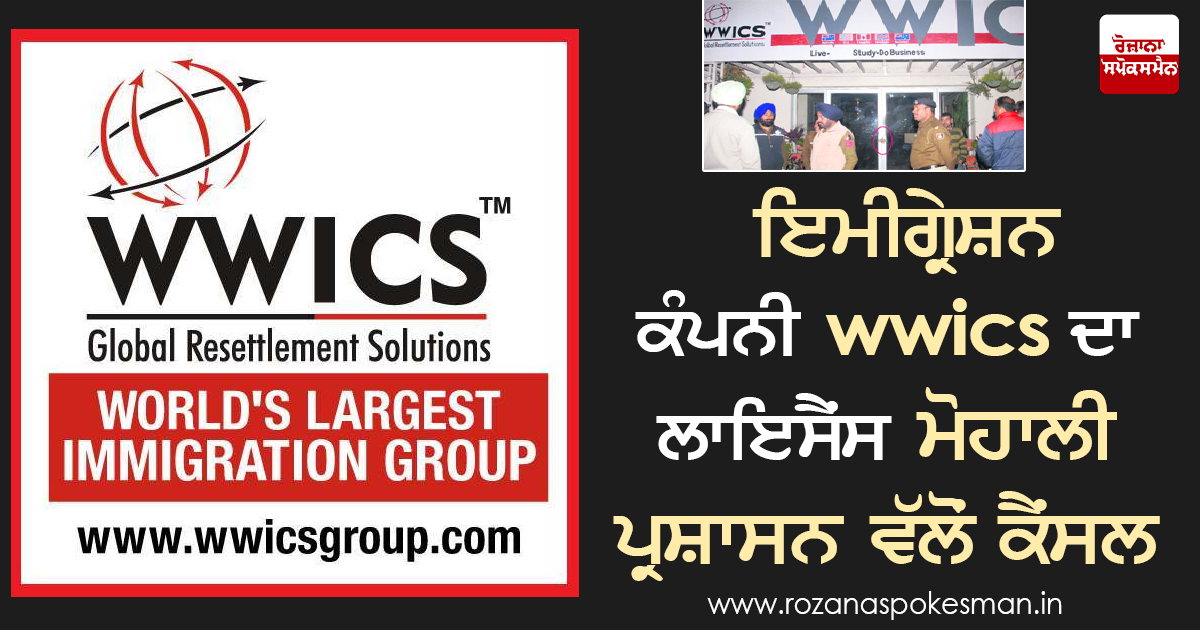 ਮੋਹਾਲੀ ਪ੍ਰਸ਼ਾਸਨ ਨੇ ਮਸ਼ਹੂਰ ਇਮੀਗ੍ਰੇਸ਼ਨ ਸਲਾਹਕਾਰ ਕੰਪਨੀ ਵਰਲਡ ਵਾਈਡ ਇਮੀਗ੍ਰੇਸ਼ਨ ਕਨਸਲਟੈਂਸੀ ਸਰਵਿਸਿਜ਼ (ਡਬਲਿਯੂ ਡਬਲਿਊ ਆਈ ਸੀ ਐਸ) ਦੇ ਲਾਇਸੈਂਸ ਕੈਂਸਲ ਕਰਨ ਦੇ ਹੁਕਮ ਜਾਰੀ ਕੀਤੇ ਹਨ ਜਿਹਨਾਂ ਦਾ ਦਫਤਰ ਮੋਹਾਲੀ ਦੇ ਫੇਸ 6 ਵਿੱਚ ਸਥਿੱਤ ਹੈ।