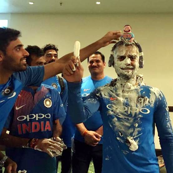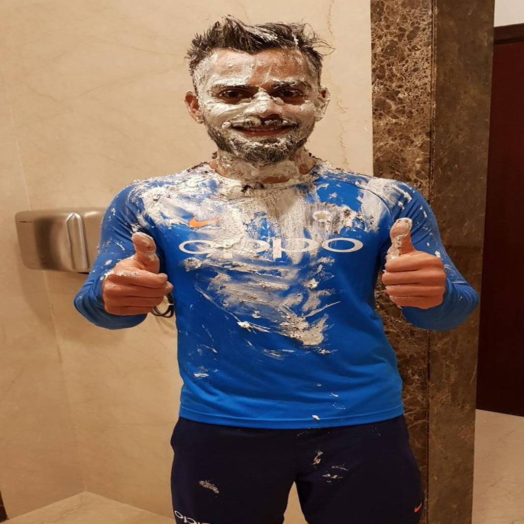 ਨਵੀਂ ਦਿੱਲੀ: ਆਪਣੇ ਖੇਡ ਦੀ ਬਦੌਲਤ ਕਰੋੜਾਂ ਲੋਕਾਂ ਨੂੰ ਆਪਣਾ ਪ੍ਰਸ਼ੰਸਕ ਬਣਾਉਣ ਵਾਲੇ ਵਿਰਾਟ ਕੋਹਲੀ ਦਾ ਅੱਜ ਜਨਮਦਿਨ ਹੈ ਤਾਂ ਸਾਫ਼ ਗੱਲ ਹੈ ਕਿ ਜਸ਼ਨ ਤਾਂ ਰਾਤ 12 ਵਜੇ ਤੋਂ ਸ਼ੁਰੂ ਹੋ ਹੀ ਗਿਆ ਹੋਵੇਗਾ। ਖੇਡ ਵਿੱਚ ਕਮਾਈ ਦੇ ਮਾਮਲੇ ਵਿੱਚ ਫੋਰਬਸ ਦੀ ਸੂਚੀ ਵਿੱਚ ਟਾਪ 10 ਵਿੱਚ ਸ਼ਾਮਿਲ ਵਿਰਾਟ ਕੋਹਲੀ ਨੇ ਜਨਮਦਿਨ ਦੀ ਮਸਤੀ ਵੀ ਸ਼ਾਨਦਾਰ ਤਰੀਕੇ ਨਾਲ ਕੀਤੀ। ਉਨ੍ਹਾਂ ਨੇ ਟਵਿਟਰ ਉੱਤੇ 4 ਅਤੇ 5 ਤਾਰੀਖ ਦੀ ਰਾਤ ਨੂੰ ਬਰਥਡੇ ਸੈਲੀਬਰੇਸ਼ਨ ਦੀਆਂ ਤਸਵੀਰਾਂ ਪੋਸਟ ਕੀਤੀਆਂ। ਉਨ੍ਹਾਂ ਦੇ ਚਿਹਰੇ ਉੱਤੇ ਪੋਚੇ ਹੋਏ ਕੇਕ ਨੂੰ ਵੇਖਕੇ ਸਮਝਿਆ ਜਾ ਸਕਦਾ ਹੈ ਕਿ ਸਾਥੀ ਕ੍ਰਿਕਟਰਸ ਨੇ ਕਿਵੇਂ ਖੂਬ ਮਜੇ ਕੀਤੇ ਹੋਣਗੇ।