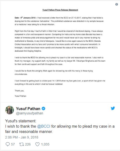 ਬੀਸੀਸੀਆਈ ਨੇ ਕਿਹਾ, ''ਪਠਾਨ ਨੇ ਇਲਜ਼ਾਮ ਨੂੰ ਸਵੀਕਾਰ ਕਰਦੇ ਹੋਏ ਦੱਸਿਆ ਕਿ ਇਹ ਗਲਤੀ ਨਾਲ ਉਸ ਦਵਾਈ ਨੂੰ ਲੈਣ ਦੇ ਕਾਰਨ ਹੋਇਆ ਹੈ ਜਿਸ ਵਿਚ ਟਰਬੂਟੇਲਾਇਨ ਮੌਜੂਦ ਸੀ। ਉਨ੍ਹਾਂ ਨੂੰ ਗਲਤੀ ਨਾਲ ਇਹ ਦਵਾਈ ਦੇ ਦਿੱਤੀ ਗਈ ਜਦੋਂ ਕਿ ਉਨ੍ਹਾਂ ਨੂੰ ਜੋ ਨੁਸਖਾ ਦਿੱਤਾ ਗਿਆ ਸੀ, ਉਸ ਵਿਚ ਕੋਈ ਪ੍ਰਤੀਬੰਧਿਤ ਦਵਾਈ ਨਹੀਂ ਸੀ। ''ਬੀਸੀਸੀਆਈ ਨੇ ਕਿਹਾ ਕਿ ਉਹ ਪਠਾਨ ਦੀ ਸਫਾਈ ਤੋਂ ਸੰਤੁਸ਼ਟ ਹਨ ਕਿ ਇਹ ਪ੍ਰਦਰਸ਼ਨ ਬਿਹਤਰ ਕਰਨ ਵਾਲੀ ਦਵਾਈ ਨਹੀਂ ਸੀ ਸਗੋਂ ਸਾਹ ਦੀ ਪ੍ਰਣਾਲੀ ਦੇ ਇਨਫੈਕਸ਼ਨ ਲਈ ਗਈ ਸੀ। ਬੀਸੀਸੀਆਈ ਨੇ ਕਿਹਾ ਕਿ ਪਠਾਨ ਨੂੰ ਪਿਛਲੇ ਸਾਲ 28 ਅਕਤੂਬਰ ਨੂੰ ਅਸਥਾਈ ਤੌਰ 'ਤੇ ਮੁਅੱਤਲ ਕੀਤਾ ਗਿਆ ਸੀ ਅਤੇ ਬੋਰਡ ਨੇ ਤੈਅ ਕੀਤਾ ਹੈ ਕਿ ਉਸ ਦੀ ਮੁਅੱਤਲੀ 15 ਅਗਸਤ ਤੋਂ ਪਰਭਾਵੀ ਹੋਵੇਗੀ ਅਤੇ ਇਸਦੀ ਮਿਆਦ 14 ਜਨਵਰੀ 2018 ਤੱਕ ਰਹੇਗੀ।