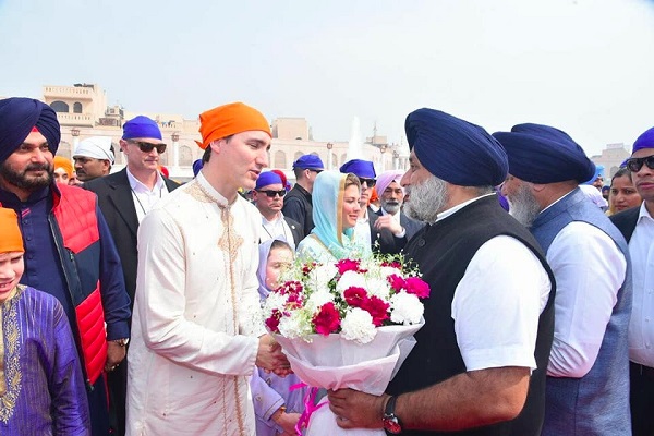 ਸ਼੍ਰੋਮਣੀ ਅਕਾਲੀ ਦਲ ਦੇ ਪ੍ਰਧਾਨ ਸੁਖਬੀਰ ਸਿੰਘ ਬਾਦਲ ਨੇ ਅੱਜ ਸ੍ਰੀ ਦਰਬਾਰ ਸਾਹਿਬ ਪੁੱਜਣ 'ਤੇ ਕੈਨੇਡਾ ਦੇ ਪ੍ਰਧਾਨ ਮੰਤਰੀ ਜਸਟਿਨ ਟਰੂਡੋ ਦਾ ਸਵਾਗਤ ਕੀਤਾ। ਸੁਖਬੀਰ ਸਿੰਘ ਬਾਦਲ ਨੇ ਸ੍ਰੀ ਦਰਬਾਰ ਸਾਹਿਬ ਦੇ ਬਾਹਰ ਹੀ ਜਸਟਿਨ ਟਰੂਡੋ ਨੂੰ ਫੁੱਲਾਂ ਦਾ ਗੁਲਦਸਤਾ ਭੇਂਟ ਕਰ ਕੇ ਸਵਾਗਤ ਕੀਤਾ। ਉਨ੍ਹਾਂ ਨਾਲ ਇਸ ਮੌਕੇ ਸ਼੍ਰੋਮਣੀ ਗੁਰਦਵਾਰਾ ਪ੍ਰਬੰਧਕ ਕਮੇਟੀ ਦੇ ਪ੍ਰਧਾਨ ਗੋਬਿੰਦ ਸਿੰਘ ਲੌਂਗੋਵਾਲ ਅਤੇ ਹੋਰ ਪਤਵੰਤੇ ਵੀ ਹਾਜ਼ਰ ਸਨ। ਬਾਅਦ 'ਚ ਸੁਖਬੀਰ ਬਾਦਲ ਨੇ ਕਈ ਟਵੀਟ ਕਰਦਿਆਂ ਕਿਹਾ ਕਿ ਕੈਨੇਡੀਆਈ ਪ੍ਰਧਾਨ ਮੰਤਰੀ ਅਤੇ ਉਨ੍ਹਾਂ ਦੇ ਪ੍ਰਵਾਰ ਦਾ ਸ੍ਰੀ ਦਰਬਾਰ ਸਾਹਿਬ ਵਿਖੇ ਸਵਾਗਤ ਕਰਨਾ ਉਨ੍ਹਾਂ ਲਈ ਮਾਣ ਦੀ ਗੱਲ ਸੀ।