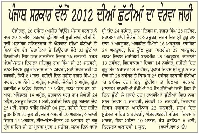2012 - ਪੰਜਾਬ ਸਰਕਾਰ ਵੱਲੋਂ 2013 ਵਾਸਤੇ ਐਲਾਨੀਆਂ 34 ਛੁੱਟੀਆਂ ਵਿੱਚੋਂ ਸਿੱਖਾਂ ਵਾਸਤੇ ਸਿਰਫ਼ 6 ਸਨ।