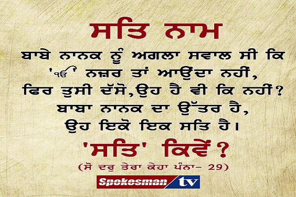 ਹੋਰ ਨਹੀਂ ਹੋ ਸਕਦਾ। ਸਤਿ ਨਾਮ ਬਾਬੇ ਨਾਨਕ ਨੂੰ ਅਗਲਾ ਸਵਾਲ ਸੀ ਕਿ 'ੴ ' ਨਜ਼ਰ ਤਾਂ ਆਉਂਦਾ ਨਹੀਂ, ਫਿਰ ਤੁਸੀ ਦੱਸੋ, ਉਹ ਹੈ ਵੀ ਕਿ ਨਹੀਂ? ਬਾਬਾ ਨਾਨਕ ਦਾ ਉੱਤਰ ਹੈ, ਉਹ ਇਕੋ ਇਕ ਸਤਿ ਹੈ। 'ਸਤਿ' ਕਿਵੇਂ? ਸਤਿ ਜਾਂ ਸੱਚ ਉਹੀ ਹੁੰਦਾ ਹੈ ਜਿਸ ਦੀ ਹੋਂਦ ਹੈ। ਇਥੇ 'ਸਤਿ' ਦਾ ਅਰਥ ਵੀ ਹੋਂਦ ਹੈ।ਪਰ ਉਸ ਅਕਾਲ ਪੁਰਖ ਨੇ ਅਪਣੇ ਅਤੇ ਸਾਡੇ ਵਿਚ ਕੂੜ ਦੀ ਇਕ ਪਾਲ ਵੀ ਖੜੀ ਕੀਤੀ ਹੋਈ ਹੈ ਜਿਸ ਕਾਰਨ ਬਾਹਰੀ ਅੱਖਾਂ ਨਾਲ ਉਹ ਸਾਨੂੰ ਨਜ਼ਰ ਨਹੀਂ ਆਉਂਦਾ।