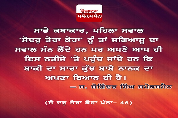ਹੁਣ ਤਕ ਦੀ ਵਿਚਾਰ ਵਿਚ ਅਸੀ ਸਮਝ ਲਿਆ ਸੀ ਕਿ 'ਸੋ ਦਰੁ' ਸ਼ਬਦ ਦੇ ਅਰਥ, ਬਾਕੀ ਦੀ ਗੁਰਬਾਣੀ ਨਾਲੋਂ ਵਖਰੇ ਤੇ ਸਾਰੀ ਬਾਣੀ ਨੂੰ ਕੱਟਣ ਵਾਲੇ ਇਸ ਲਈ ਨਿਕਲਦੇ ਹਨ ਕਿਉਂਕਿ ਸਾਰੇ ਸ਼ਬਦ ਨੂੰ ਸਾਡੇ ਕਥਾਕਾਰ (ਸ਼੍ਰੋਮਣੀ ਵਿਆਖਿਆਕਾਰਾਂ ਸਮੇਤ) ਬਾਬੇ ਨਾਨਕ ਦਾ ਬਿਆਨ ਸਮਝ ਕੇ ਉਸ ਦੀ ਕਥਾ ਕਰਨ ਲੱਗ ਪੈਂਦੇ ਹਨ, ਜੋ ਕਿ ਸਹੀ ਨਹੀਂ ਹੈ। ਕਵਿਤਾ ਦੀ ਜਿਹੜੀ ਵਨਗੀ ਨੂੰ ਇਥੇ ਵਰਤਿਆ ਗਿਆ ਹੈ, ਉਸ ਵਿਚ ਉਨ੍ਹਾਂ ਦਾ ਅਪਣਾ ਬਿਆਨ ਤਾਂ ਬੜਾ ਛੋਟਾ ਜਿਹਾ ਹੈ ਤੇ ਬਾਕੀ ਦੇ ਸਾਰੇ ਤਾਂ ਜਗਿਆਸੂਆਂ ਦੇ ਪ੍ਰਸ਼ਨ ਹਨ ਜਾਂ ਦ੍ਰਿਸ਼ਟਾਂਤ ਹਨ। ਬਾਬਾ ਨਾਨਕ ਨੇ ਅਪਣਾ ਜਵਾਬ ਅਖ਼ੀਰ ਵਿਚ ਦਰਜ ਕੀਤਾ ਹੈ ਤੇ ਪਹਿਲਾਂ ਜਗਿਆਸੂਆਂ ਦੇ ਪ੍ਰਸ਼ਨ ਦਰਜ ਕੀਤੇ ਹਨ। ਇਹੀ ਠੀਕ ਢੰਗ ਹੈ ਤੇ ਸਾਰੇ ਕਵੀ ਇਹੀ ਢੰਗ ਵਰਤਦੇ ਹਨ। ਸਾਡੇ ਕਥਾਕਾਰ, ਪਹਿਲਾ ਸਵਾਲ 'ਸੋਦਰੁ ਤੇਰਾ ਕੇਹਾ' ਨੂੰ ਤਾਂ ਜਗਿਆਸੂ ਦਾ ਸਵਾਲ ਮੰਨ ਲੈਂਦੇ ਹਨ ਪਰ ਅਪਣੇ ਆਪ ਹੀ ਇਸ ਨਤੀਜੇ 'ਤੇ ਪਹੁੰਚ ਜਾਂਦੇ ਹਨ ਕਿ ਬਾਕੀ ਦਾ ਸਾਰਾ ਕੁੱਝ ਬਾਬੇ ਨਾਨਕ ਦਾ ਅਪਣਾ ਬਿਆਨ ਹੀ ਹੈ। ਅਜਿਹਾ ਕਰਦੇ ਹੋਏ ਜੇ ਉਹ ਸਾਰੀ ਬਾਣੀ ਵਲ ਝਾਤ ਨਾ ਵੀ ਮਾਰਨ ਤੇ ਕੇਵਲ 'ਜਪੁਜੀ' ਸਾਹਿਬ ਦੀ ਬਾਣੀ ਵਲ ਹੀ ਧਿਆਨ ਨਾਲ ਵੇਖ ਲੈਣ ਤਾਂ ਉਨ੍ਹਾਂ ਨੂੰ ਪਤਾ ਲੱਗ ਜਾਏਗਾ ਕਿ ਬਾਬਾ ਨਾਨਕ ਉਨ੍ਹਾਂ ਸਾਰੀਆਂ ਗੱਲਾਂ ਦੇ ਵਿਰੁਧ ਬਿਆਨ ਬਾਣੀ ਰਾਹੀਂ ਦੇ ਚੁਕੇ ਹਨ ਜਿਨ੍ਹਾਂ ਨੂੰ ਇਸ ਸ਼ਬਦ ਰਾਹੀਂ, ਗੁਰੂ ਦਾ ਬਿਆਨ ਦਸਿਆ ਜਾ ਰਿਹਾ ਹੈ। ਜੇ ਇਸ ਸ਼ਬਦ ਨੂੰ ਬਾਬਾ ਨਾਨਕ ਜੀ ਦਾ ਬਿਆਨ ਮੰਨ ਲਿਆ ਗਿਆ ਤਾਂ ਸਾਰੀ ਬਾਣੀ ਅਪਣੇ ਆਪ ਕੱਟੀ ਜਾਏਗੀ ਤੇ ਕਣ ਕਣ ਵਿਚ ਰਮਿਆ ਹੋਇਆ ਅਕਾਲ ਪੁਰਖ, ਇਕ