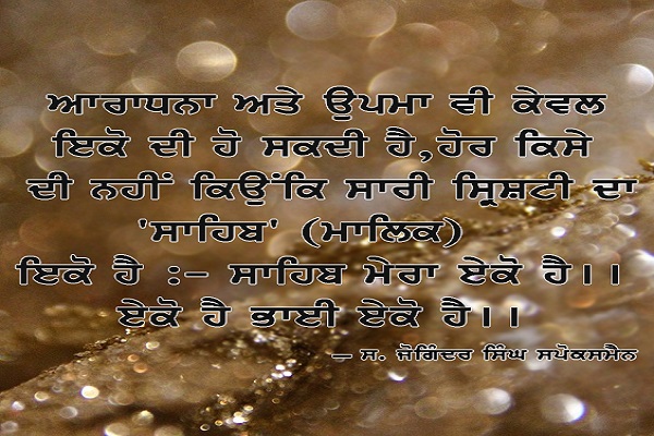 ਬਾਬੇ ਨਾਨਕ ਦੇ ਘਰ ਵਿਚ ਆਰਾਧਨਾ ਤੇ ਉਪਮਾ ਕੇਵਲ 'ਇਕ' ਦੀ ਹੋ ਸਕਦੀ ਹੈ, ਹੋਰ ਕਿਸੇ ਬਾਬੇ ਨਾਨਕ ਦਾ ਘਰ, ਧਰਮ ਦਾ ਘਰ ਹੈ। ਧਰਮਦੇ ਇਸ ਘਰ ਵਿਚ, ਬੀਤੇ ਵਿਚ ਦੇਵੀ ਦੇਵਤਿਆਂ,ਧਰਮਾਂ ਦੇ ਬਾਨੀਆਂ, ਪੀਰਾਂ, ਪੈਗ਼ੰਬਰਾਂ, ਮਹਾਤਮਾਵਾਂ ਨੂੰ ਰੱਬ ਵਾਂਗ ਪੂਜਿਆ ਜਾਂਦਾ ਰਿਹਾ ਹੈ। ਹੌਲੀ ਹੌਲੀ ਰੱਬ ਦੂਰ ਹੁੰਦਾ ਜਾਂਦਾ ਹੈ ਤੇ ਧਰਮ ਦੇ ਬਾਨੀ, ਪੀਰ, ਪੈਗ਼ੰਬਰ ਤੇ ਮਹਾਤਮਾ ਲੋਕ ਹੀ ਪੂਜੇ ਜਾਣ ਲਗਦੇ ਸਨ ਤੇ ਕਈ ਘਰਾਣਿਆਂ ਦੇ 'ਕੁਲ-ਦੇਵਤਾ', 'ਕੁਲਪ੍ਰ ੋਹਿਤ' ਤੇ 'ਕੁਲ-ਮਹਾਤਮਾ'² ਬਣ ਜਾਂਦੇ ਸਨ। ਬਾਬਾ ਨਾਨਕ ਨੇ ਸਾਰੇ ਮਨੁੱਖਾਂ ਨੂੰ ਇਕ ਇਕਾਈ ਵਜੋਂ ਲਿਆ ਤੇ ਇਕ ਪਿਤਾ ਦੀ ਸੰਤਾਨ ਮੰਨਿਆ, ਇਸ ਲਈ ਸੱਭ ਦਾ ਗੁਰੂ ਵੀ ਇਕ ਅਕਾਲ ਪੁਰਖ ਨੂੰ ਹੀ ਮੰਨਿਆ, ਇਕੋ ਨੂੰ ਦਾਤਾਰ ਮੰਨਿਆ (ਬਾਕੀ ਸਭਨਾਂ ਨੂੰ ਮੰਗਤੇ), ਇਸ ਲਈ ਆਰਾਧਨਾ ਤੇ ਉਪਮਾ ਵੀ ਕੇਵਲ ਇਕੋ ਦੀ ਹੀ ਹੋ ਸਕਦੀ ਹੈ, ਹੋਰ ਕਿਸੇ ਦੀ ਨਹੀਂ ਕਿਉਂਕਿ ਸਾਰੀ ਸ੍ਰਿਸ਼ਟੀ ਦਾ 'ਸਾਹਿਬ' (ਮਾਲਕ)