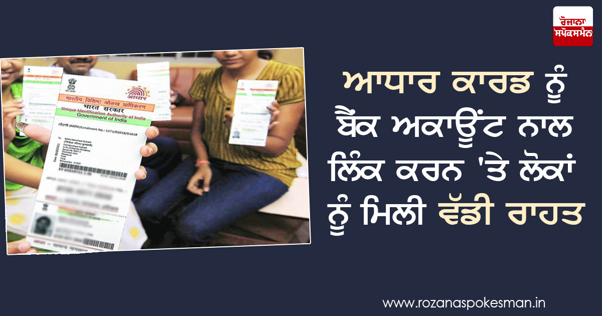 ਨਵੀਂ ਦਿੱਲੀ- ਸਰਕਾਰੀ ਸਕੀਮਾਂ ਅਤੇ ਬੈਂਕ ਖਾਤੇ ਨਾਲ ਆਧਾਰ ਲਿੰਕ ਕਰਨ ਦੀ ਆਖਰੀ ਤਰੀਕ 31 ਮਾਰਚ 2018 ਤੱਕ ਵਧਾ ਦਿੱਤੀ ਜਾਵੇਗੀ। ਕੇਂਦਰ ਸਰਕਾਰ ਨੇ ਅੱਜ ਸੁਪਰੀਮ ਕੋਰਟ 'ਚ ਇਸ ਦੀ ਜਾਣਕਾਰੀ ਦਿੱਤੀ ਹੈ। ਹਾਲਾਂਕਿ ਜਾਣਕਾਰੀ ਮੁਤਾਬਕ, ਇਹ ਰਾਹਤ ਸਿਰਫ ਉਨ੍ਹਾਂ ਲੋਕਾਂ ਨੂੰ ਹੀ ਮਿਲੇਗੀ ਜਿਨ੍ਹਾਂ ਕੋਲ ਅਜੇ ਤੱਕ ਆਧਾਰ ਕਾਰਡ ਨਹੀਂ ਹੈ।