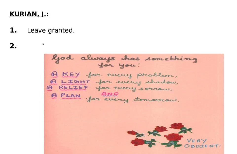 ਬੱਚੇ ਵਲੋਂ ਜ਼ਿੰਦਗੀ ਦੇ ਗੰਭੀਰ ਮਾਮਲਿਆਂ ਬਾਰੇ ਦਿਖਾਈ ਗਈ ਦਿਲਚਸਪੀ ਨੇ ਜਸਟਿਸ ਕੁਰੀਅਨ ਜੋਸਫ਼ ਅਤੇ ਜਸਟਿਸ ਮੋਹਨ ਐਮ ਸ਼ਾਂਤਨਾਗਾਊਡਰ ਦਾ ਮਨ ਮੋਹ ਲਿਆ। ਕੇਸ ਦੀ ਸੁਣਵਾਈ ਸਮੇਂ 5 ਮਾਰਚ ਨੂੰ ਬੱਚਾ ਅਦਾਲਤ ਵਿਚ ਹਾਜ਼ਰ ਸੀ ਅਤੇ ਮਾਪਿਆਂ ਦਾ ਵਿਵਾਦ ਸੁਲਝਣ ਮਗਰੋਂ ਉਸ ਨੇ ਖ਼ੁਸ਼ੀ ਦਾ ਪ੍ਰਗਟਾਵਾ ਕੀਤਾ ਤੇ ਅਪਣੇ ਜਜ਼ਬੇ ਨੂੰ ਇਕ ਕਾਰਡ ਵਿਚ ਪਰੋ ਕੇ ਜੱਜਾਂ ਨੂੰ ਸੌਂਪਿਆ।