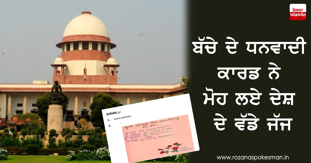 ਚੰਡੀਗੜ੍ਹ : ਚੰਡੀਗੜ੍ਹ ਦੇ ਦਸ ਸਾਲਾ ਮਾਸੂੂਮ ਬੱਚੇ ਵਲੋਂ ਸੁਪਰੀਮ ਕੋਰਟ ਨੂੰ ਪੇਸ਼ ਕੀਤੇ ਗਏ ਧਨਵਾਦੀ ਕਾਰਡ ਨੇ ਅਦਾਲਤ ਦੇ ਜੱਜਾਂ ਦਾ ਮਨ ਮੋਹ ਲਿਆ ਹੈ। ਬੱਚੇ ਨੇ ਅਪਣੇ ਮਾਤਾ-ਪਿਤਾ ਦੇ ਵਿਆਹੁਤਾ ਜੀਵਨ ਦੇ ਵਿਵਾਦ ਸਬੰਧੀ 23 ਮਾਮਲੇ ਹੱਲ ਕਰਨ ਅਤੇ ਉਨ੍ਹਾਂ ਨੂੰ ਤਲਾਕ ਦਿਵਾਉਣ ਲਈ ਜੱਜਾਂ ਦਾ ਧਨਵਾਦ ਕੀਤਾ। ਬੱਚੇ ਦੇ ਮਾਪਿਆਂ ਵਿਚ ਪਿਛਲੇ ਸੱਤ ਸਾਲਾਂ ਤੋਂ ਵਿਵਾਦ ਚਲ ਰਿਹਾ ਸੀ ਤੇ ਹੁਣ ਦੋਹਾਂ ਦਾ ਤਲਾਕ ਹੋ ਗਿਆ ਹੈ।