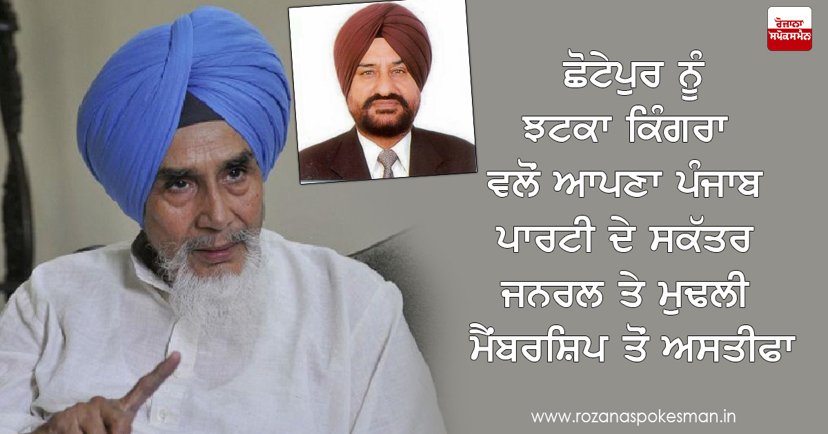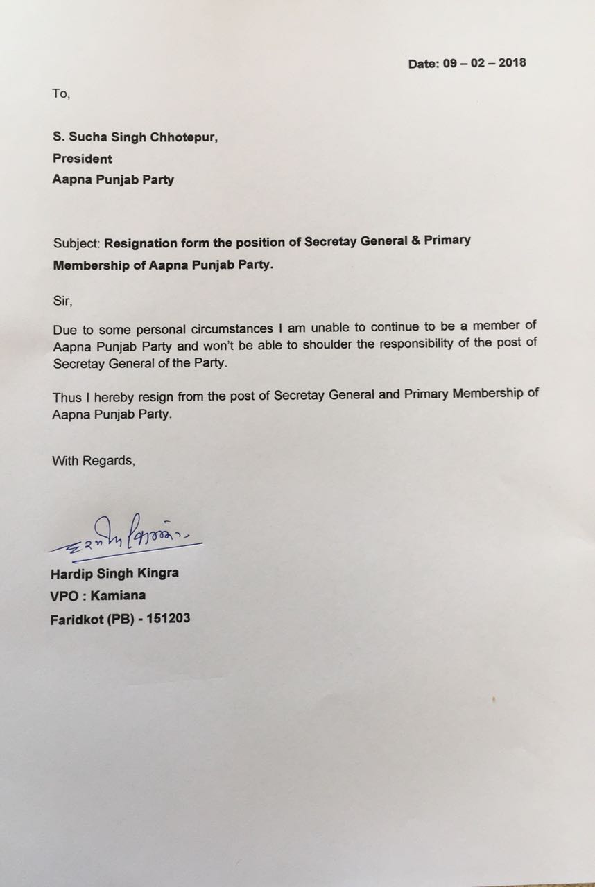 ਆਪਣਾ ਪੰਜਾਬ ਪਾਰਟੀ (ਏਪੀਪੀ) ਦੇ ਸਕੱਤਰ ਜਨਰਲ ਦੇ ਅਹੁਦੇ ਸਣੇ ਪਾਰਟੀ ਦੀ ਮੁਢਲੀ ਮੈਂਬਰਸ਼ਿਪ ਤੋਂ ਅਸਤੀਫਾ ਦੇ ਦਿੱਤਾ ਹੈ। ਸਾਬਕਾ ਆਈਐਫਐਸ ਅਧਿਕਾਰੀ ਕਿੰਗਰਾ ਨੇ ਛੋਟੇਪੁਰ ਨੂੰ ਭੇਜੇ ਅਸਤੀਫੇ ਦੀ ਨਕਲ 'ਰੋਜ਼ਾਨਾ ਸਪੋਕਸਮੈਨ' ਨਾਲ ਸਾਂਝੀ ਕਰਦੇ ਹੋਏ ਭਾਵੇਂ ਆਪਣੇ ਅਸਤੀਫੇ ਦਾ ਕਾਰਨ ਨਿਜੀ ਦੱਸਿਆ ਹੈ।