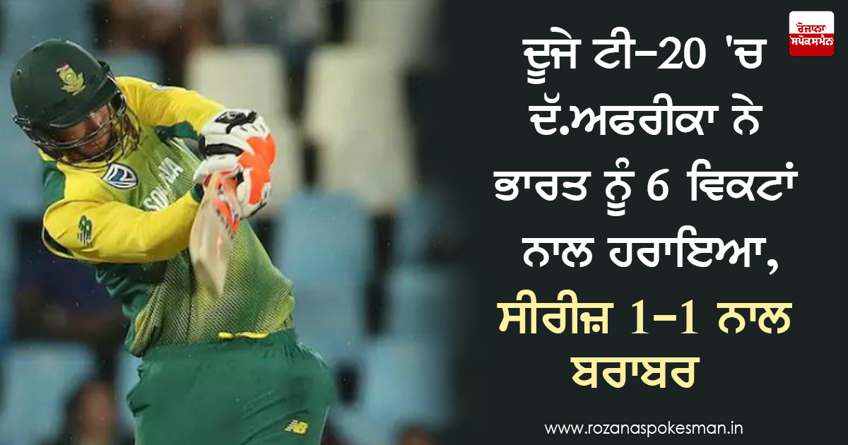 ਸੈਂਚੁਰੀਅਨ : ਹੈਨਰਿਕਸ ਕਲਾਸੇਨ ਦੇ ਤੂਫਾਨੀ ਅਤੇ ਕਪਤਾਨ ਜੇ. ਪੀ. ਡੁਮਿਨੀ ਦੇ ਹੌਸਲੇ ਨਾਲ ਬਣਾਏ ਅਰਧ-ਸੈਂਕੜੇ ਨਾਲ ਦੱਖਣੀ ਅਫਰੀਕਾ ਨੇ ਟਵੰਟੀ-20 ਅੰਤਰਰਾਸ਼ਟਰੀ ਕ੍ਰਿਕਟ ਮੈਚ ਵਿਚ ਭਾਰਤ ਨੂੰ 6 ਵਿਕਟਾਂ ਨਾਲ ਹਰਾ ਕੇ 3 ਮੈਚਾਂ ਦੀ ਲੜੀ 1-1 ਨਾਲ ਬਰਾਬਰ ਕਰ ਦਿੱਤੀ।
