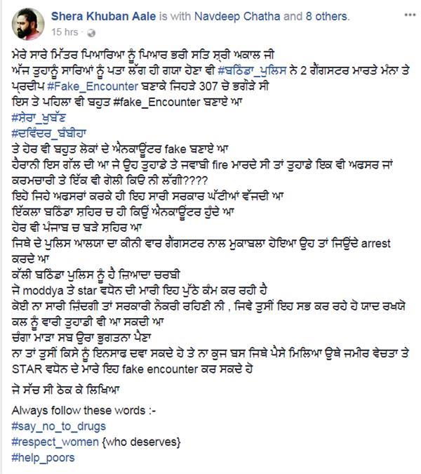 ਸ਼ੁੱਕਰਵਾਰ ਨੂੰ ਬਠਿੰਡੇ ਦੇ ਪਿੰਡ ਗੁਲਾਬਗੜ ਵਿੱਚ ਗੈਂਗਸਟਰਾਂ ਅਤੇ ਪੁਲਿਸ ਦੇ ਵਿੱਚ ਹੋਈ ਮੁੱਠਭੇੜ ਨੂੰ ਗੌਂਡਰ ਗੈਂਗ ਨੇ ਫੇਕ ਐਨਕਾਊਂਟਰ ਕਰਾਰ ਦਿੱਤਾ ਹੈ। ਸ਼ੇਰਾ ਖੁੱਬਨ ਗਰੁੱਪ ਨਾਮ ਦੇ ਫੇਸਬੁਕ ਪੇਜ ਉੱਤੇ ਗੌਂਡਰ ਗੈਂਗ ਨੇ ਲਿਖਿਆ ਹੈ ਕਿ ਸਟਾਰ ਲਗਾਉਣ ਲਈ ਬਠਿੰਡਾ ਪੁਲਿਸ ਫੇਕ ਐਨਕਾਊਂਟਰ ਕਰਵਾ ਰਹੀ ਹੈ।